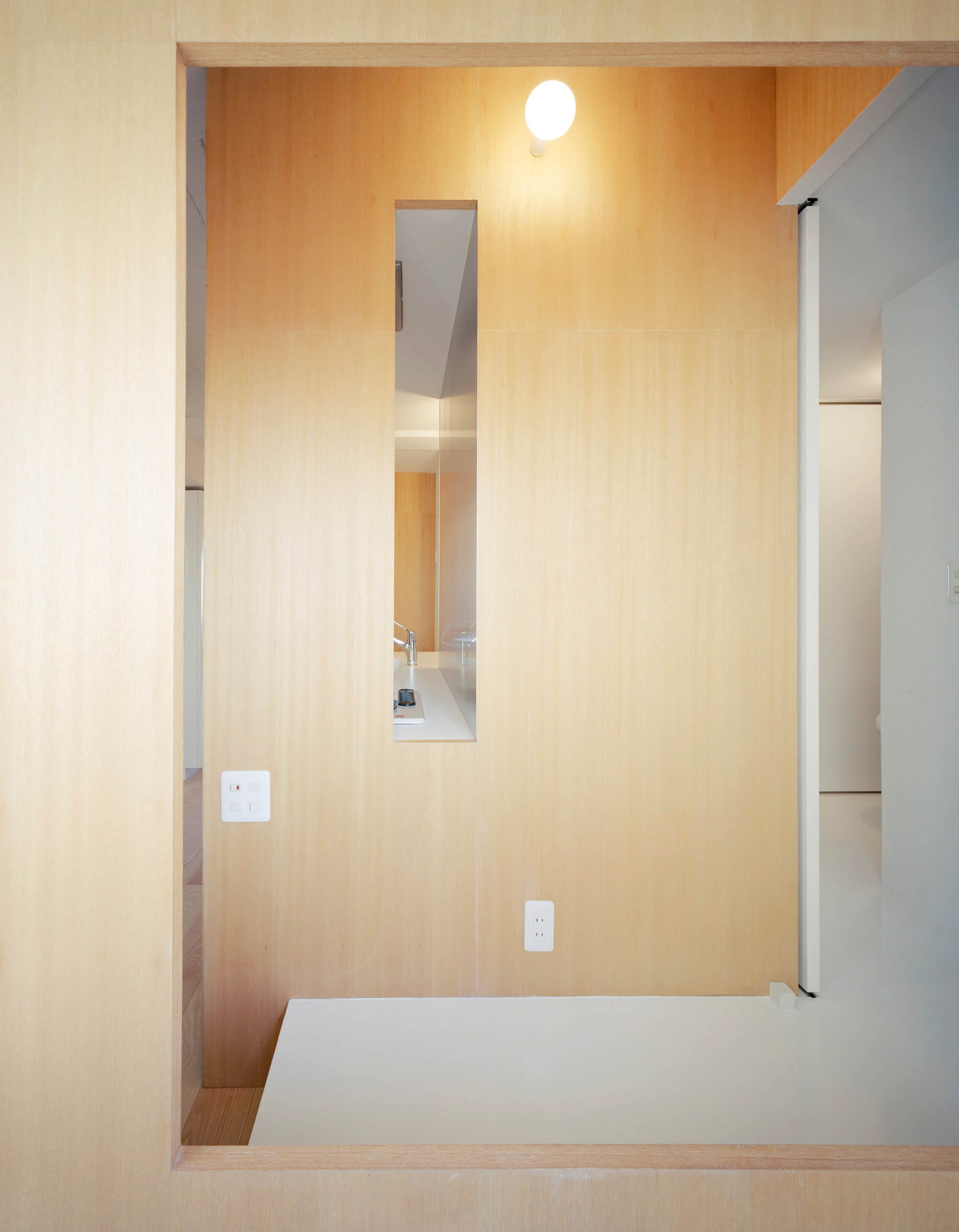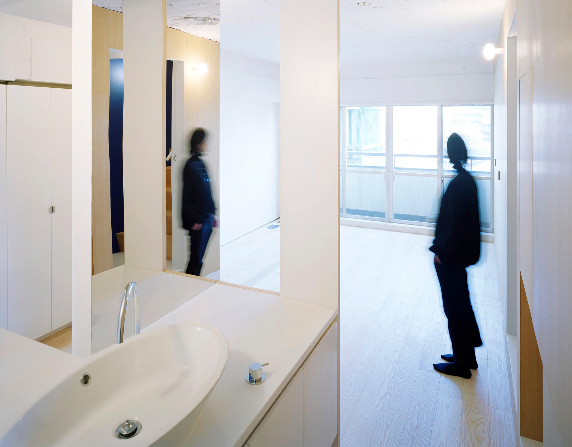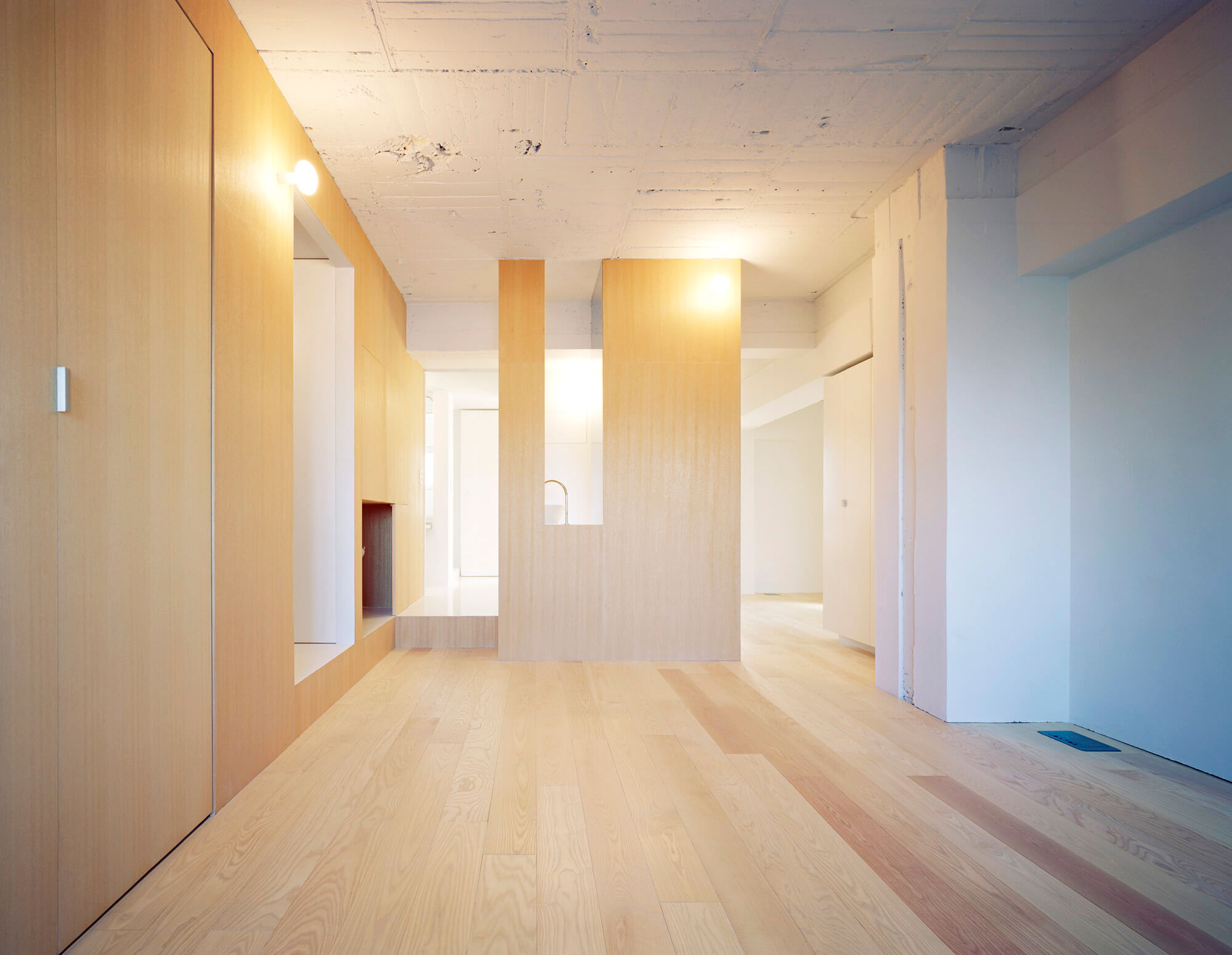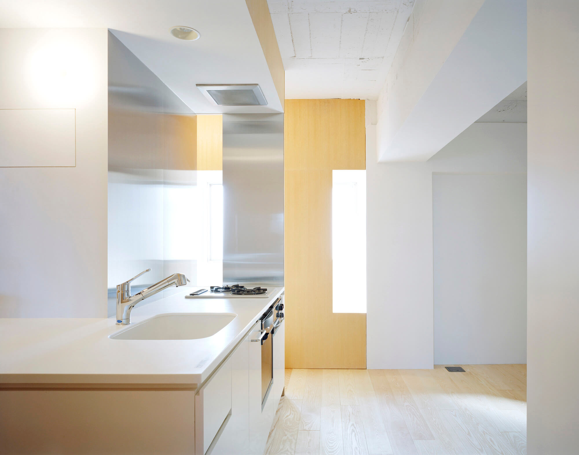舞台のセットのようなつくりのキッチン、洗面、バスルーム、ベット、収納を考え、それらが個別に機能しながらもつながり、東西にある開口からのひかりや風が室全体に入り込むようになった。また、長年大切に使ってきた家具のおさまるところ、合う素材を考慮した甲斐あって、住み始めた途端にもうずいぶんと暮らしてきたかのように馴染んでいる。