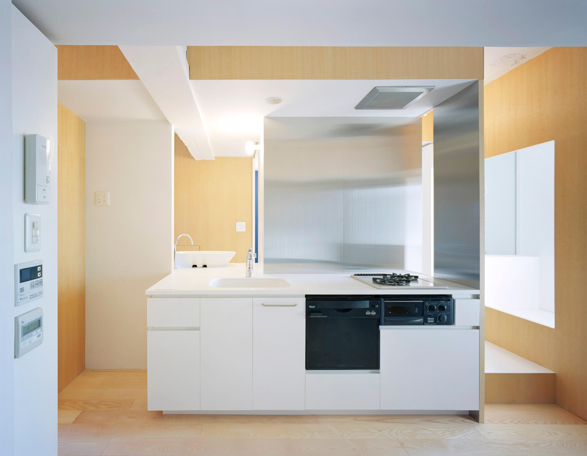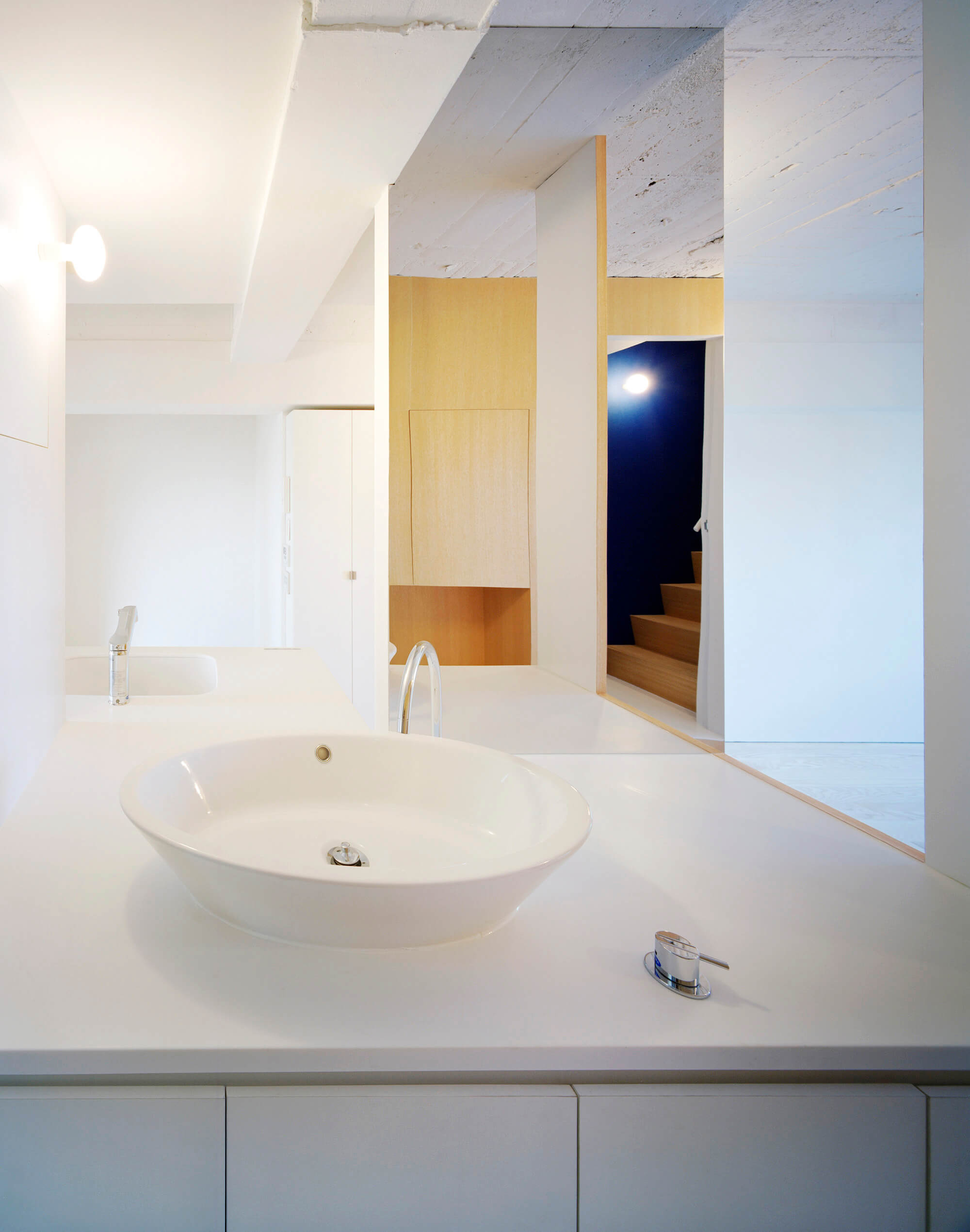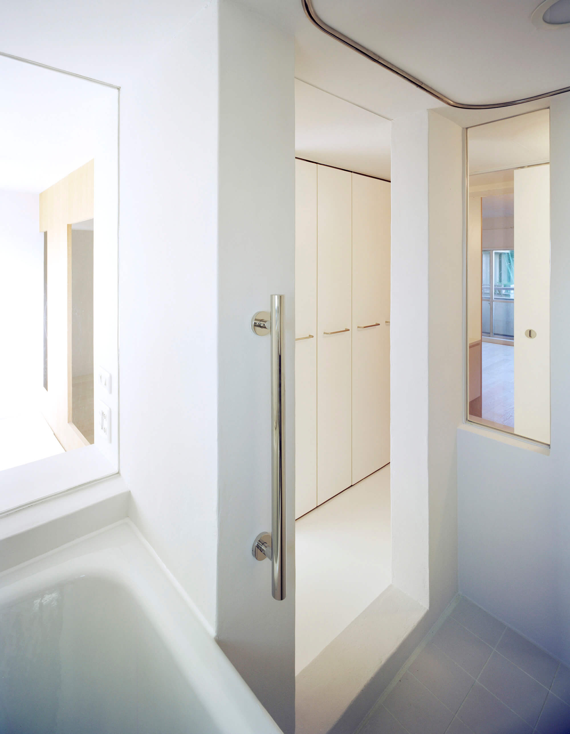 舞台のセットのようなつくりのキッチン、洗面、バスルーム、ベット、収納を考え、それらが個別に機能しながらもつながり、東西にある開口からのひかりや風が室全体に入り込むようになった。また、長年大切に使ってきた家具のおさまるところ、合う素材を考慮した甲斐あって、住み始めた途端にもうずいぶんと暮らしてきたかのように馴染んでいる。