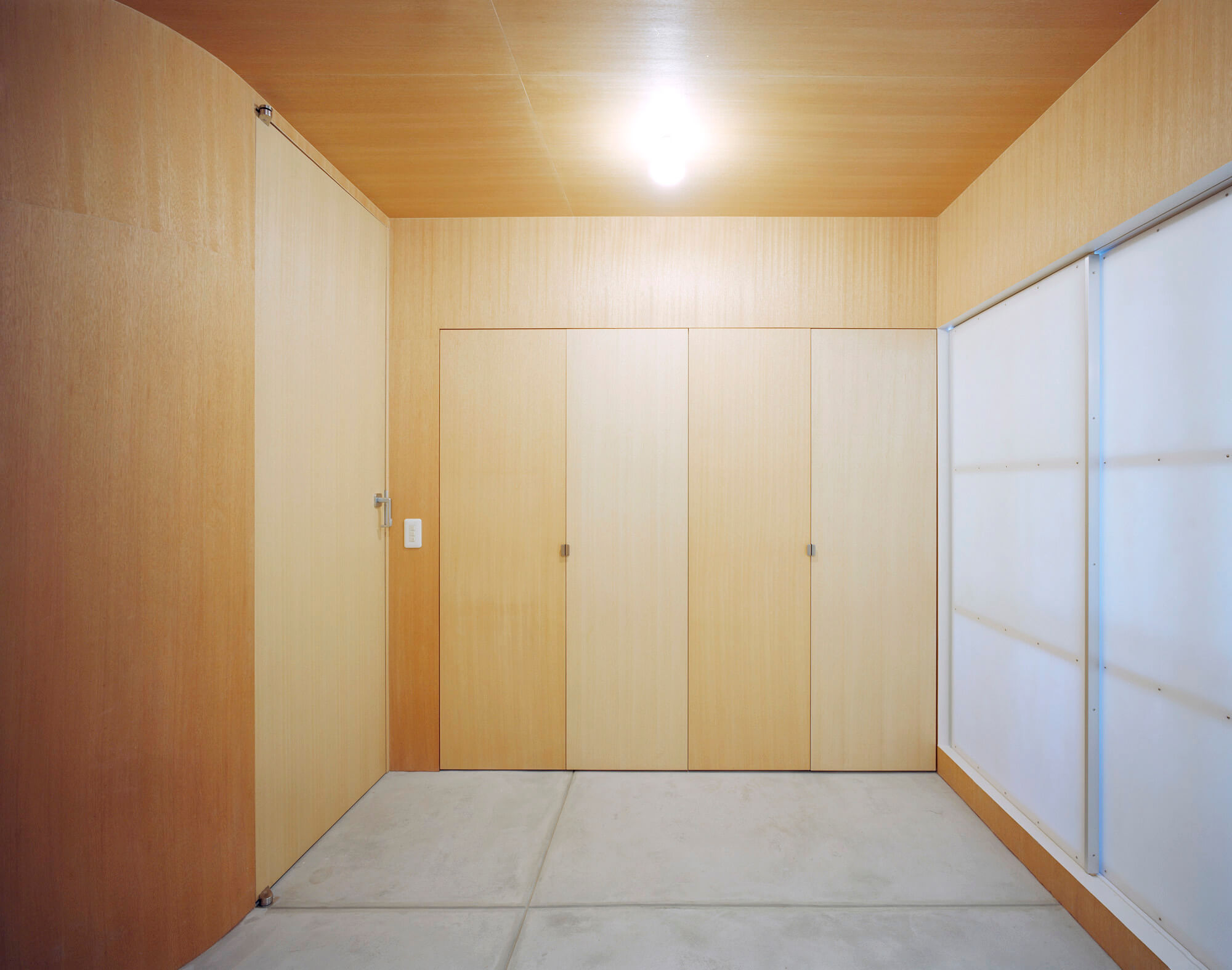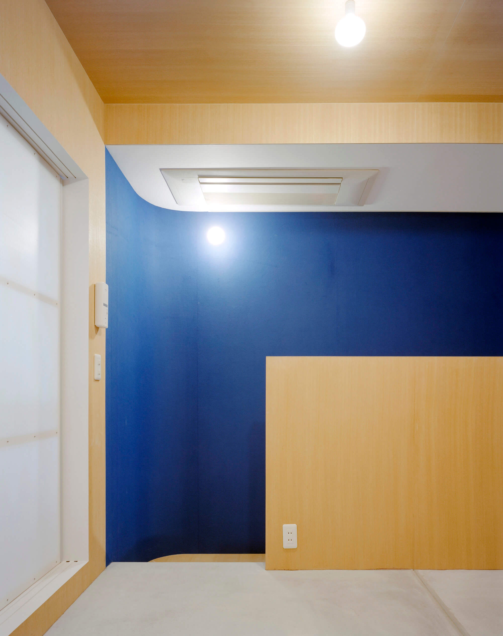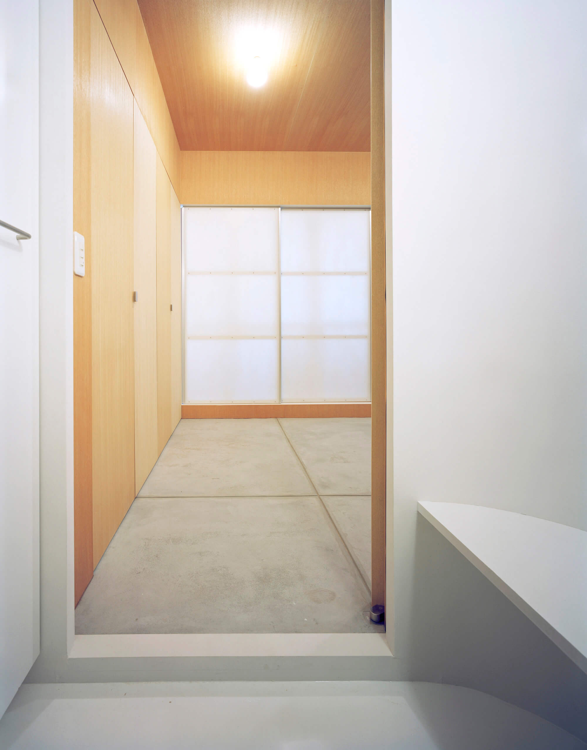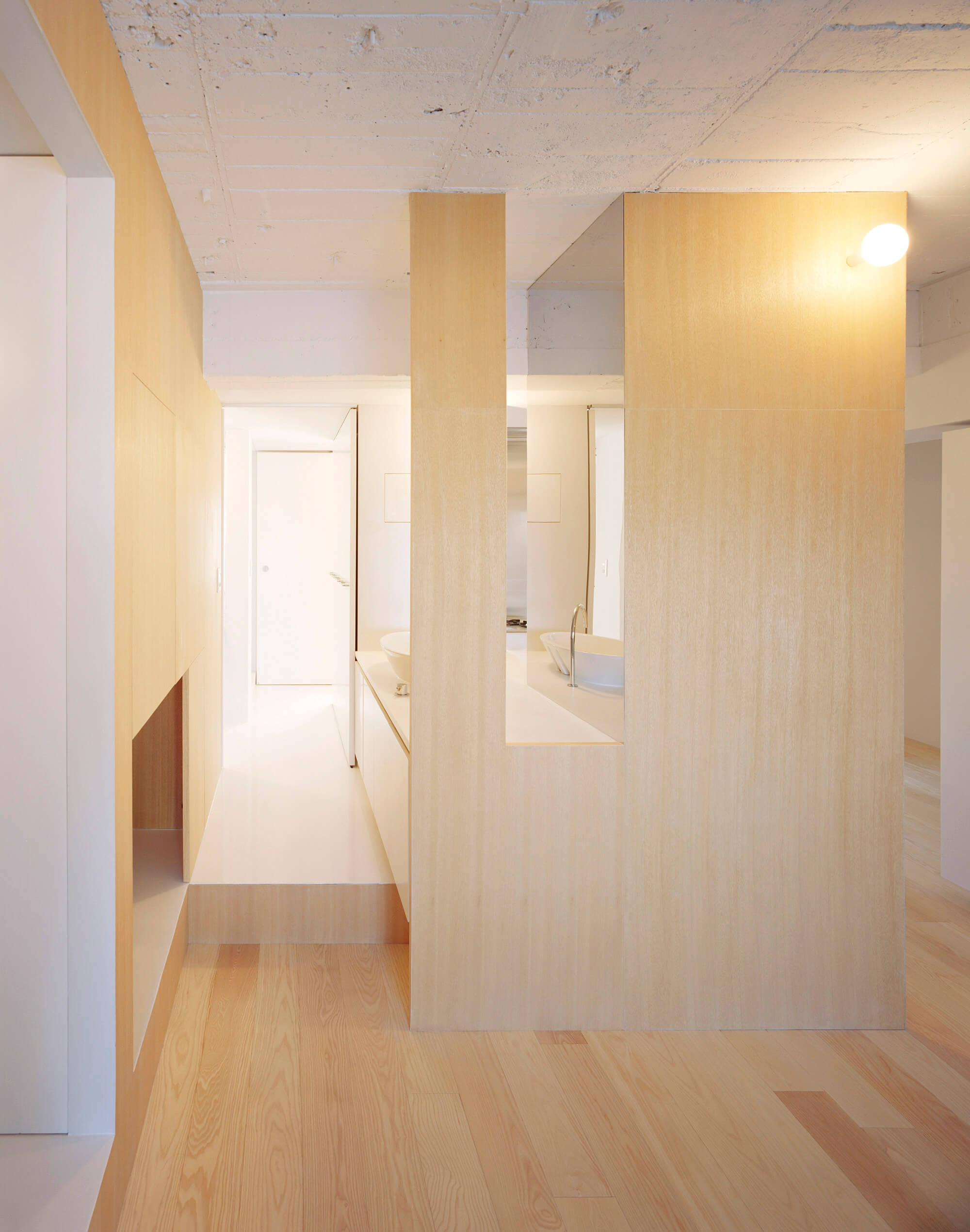 舞台のセットのようなつくりのキッチン、洗面、バスルーム、ベット、収納を考え、それらが個別に機能しながらもつながり、東西にある開口からのひかりや風が室全体に入り込むようになった。また、長年大切に使ってきた家具のおさまるところ、合う素材を考慮した甲斐あって、住み始めた途端にもうずいぶんと暮らしてきたかのように馴染んでいる。