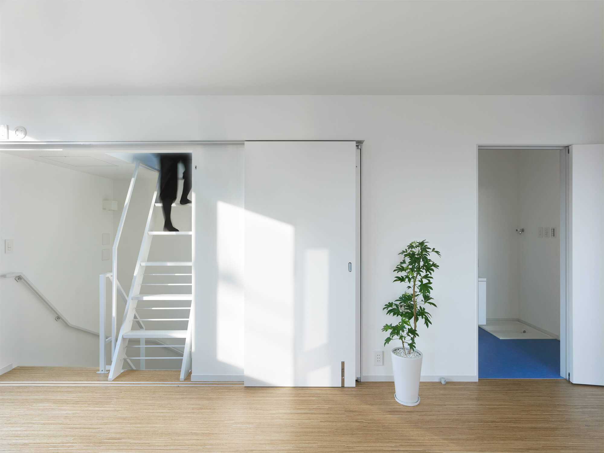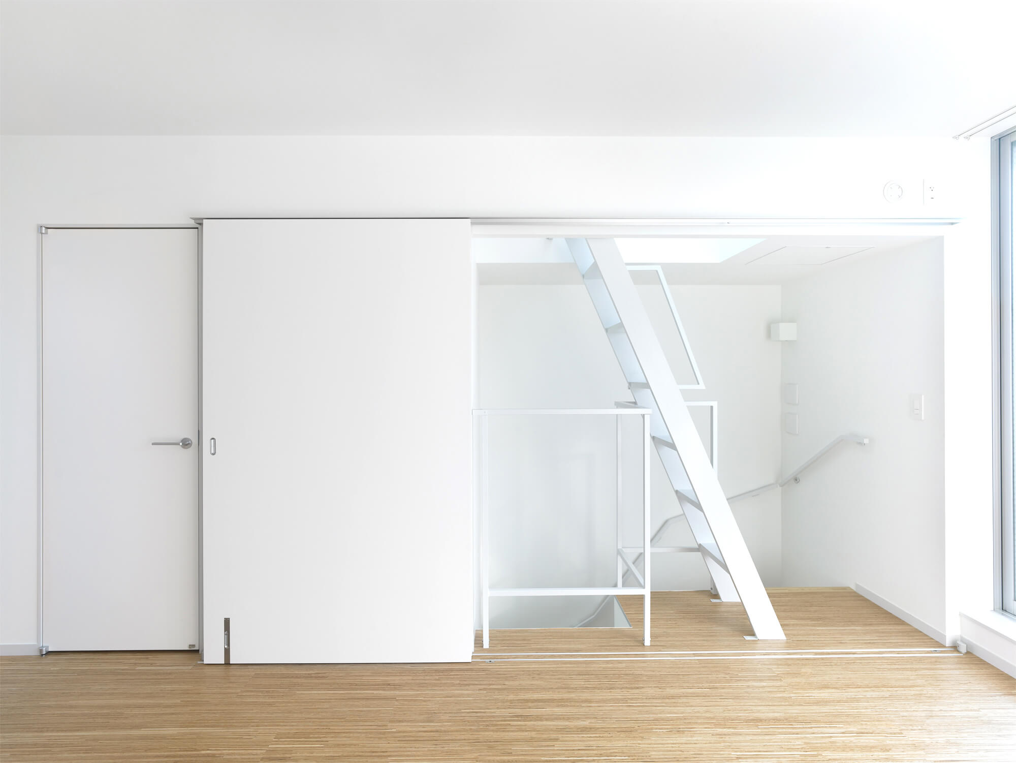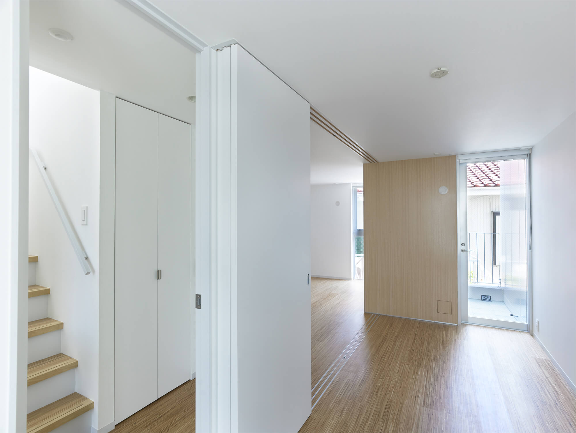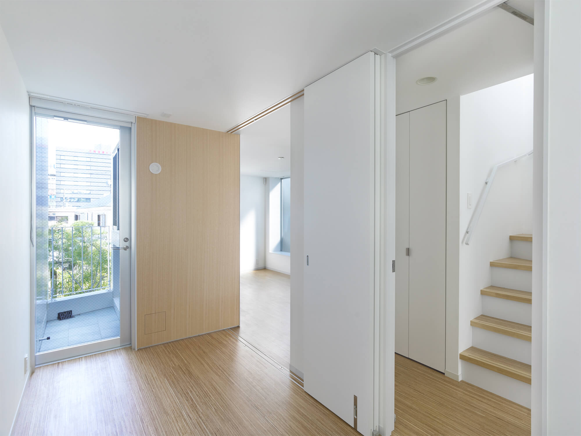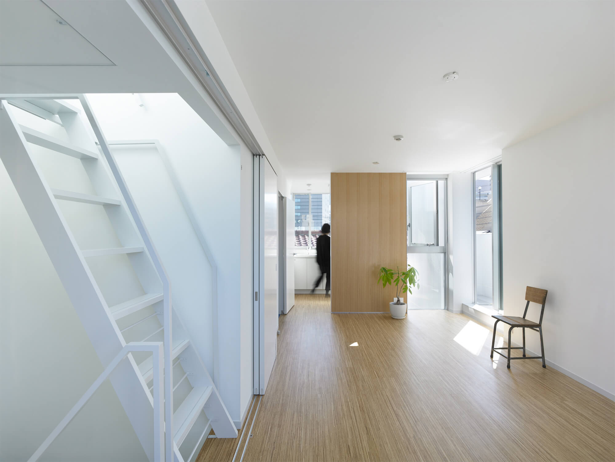 テナント企業側からのアプローチで始まった計画のため、建物の配置が店舗の必要面積と駐車効率により、交差点から隣地側に大きくセットバックしたかたちで既に決められていた。隣地側に寄った配置という条件の中で、2・3Fの住戸をメゾネット形式とし、各住戸と住戸の間に2層分の外部をスリット状に入れることで、採光と通風を確保、また隣地からの距離感をつくり出している。