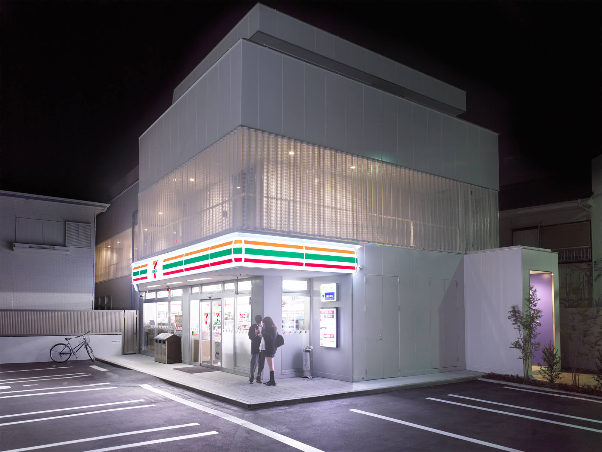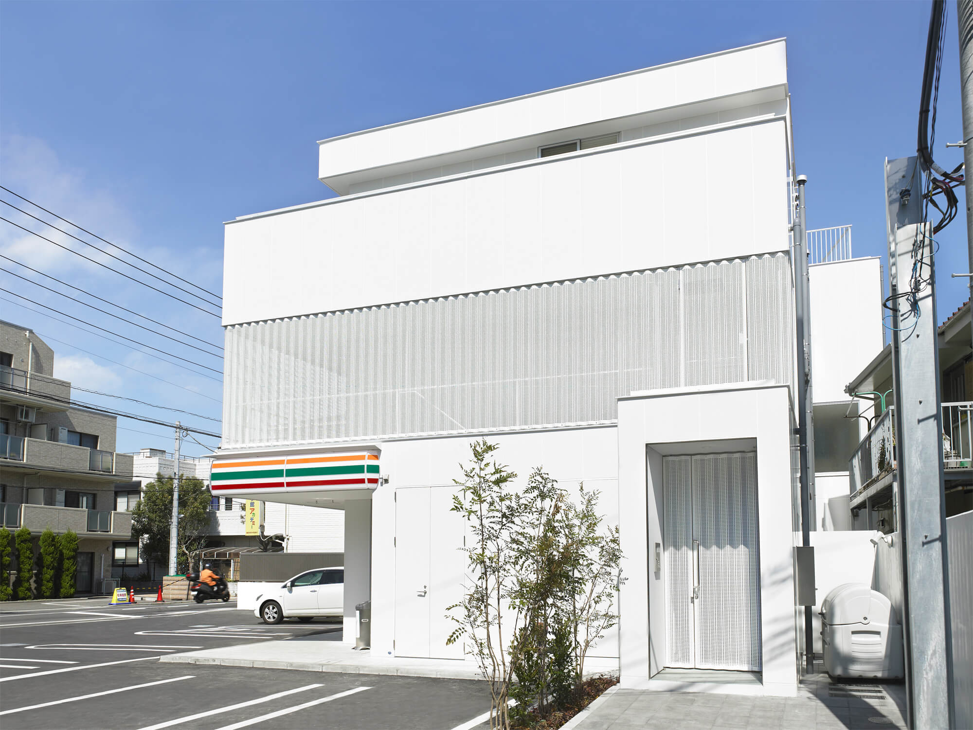 敷地周辺は駅から近いにも関わらず、道路幅も狭く歩道の整備も進んでいない。店舗のための駐車場が必要だったとはいえ交差点に接した敷地の半分ほどを開放したこと、また賃貸住居の共用廊下を包んだ有孔折板がつくりだすやわらかな表情がこの街角を物理的にも感覚的にも一変させた。
