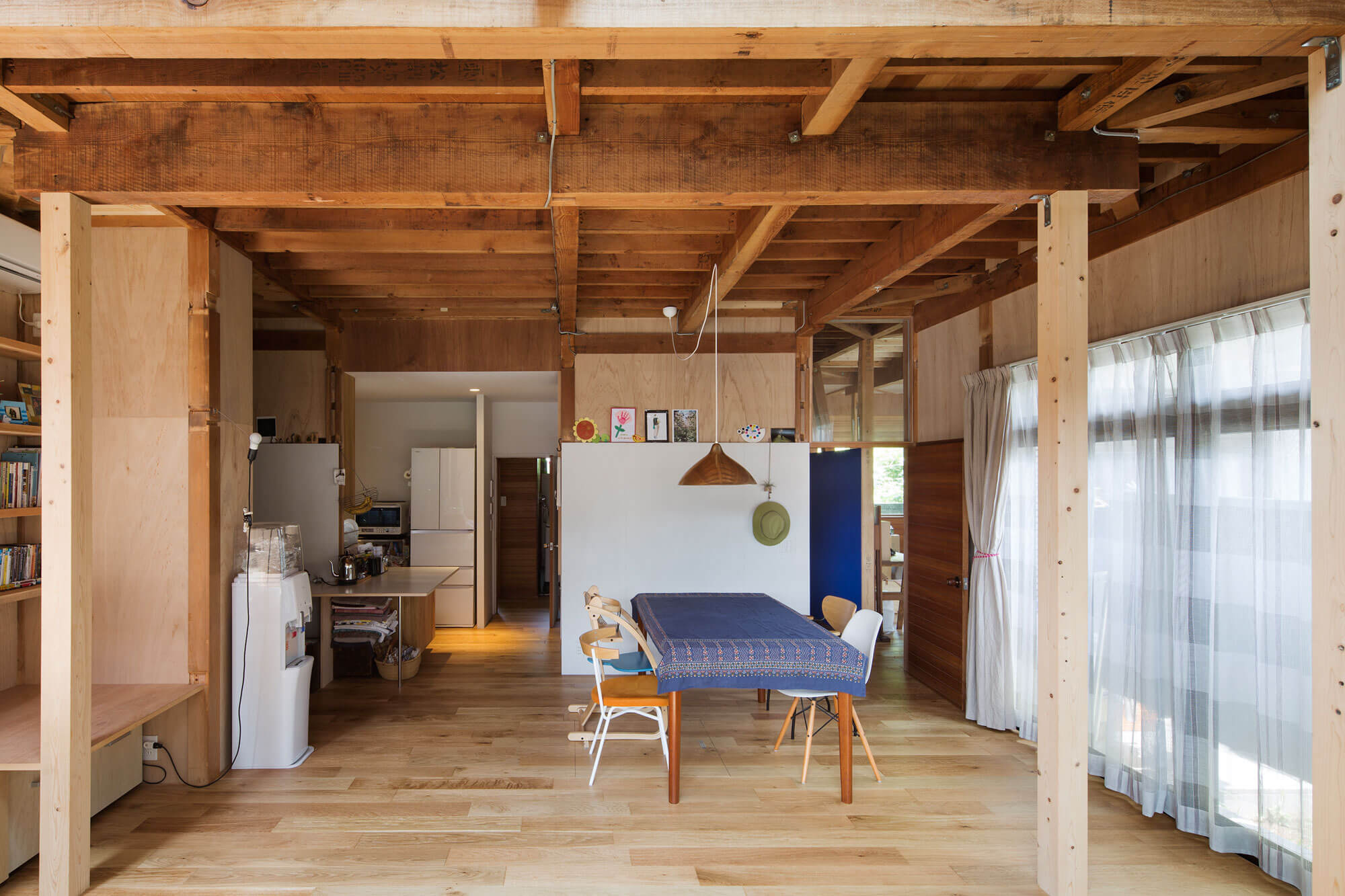 1階の台所、食堂(和室6畳)、居間(和室8畳)と鴨居と襖によって仕切られた部屋を一体的なスペースとし、玄関からすぐの応接間は、廊下との壁を撤去し屏風のような低い壁で囲んだ仕事場とした。