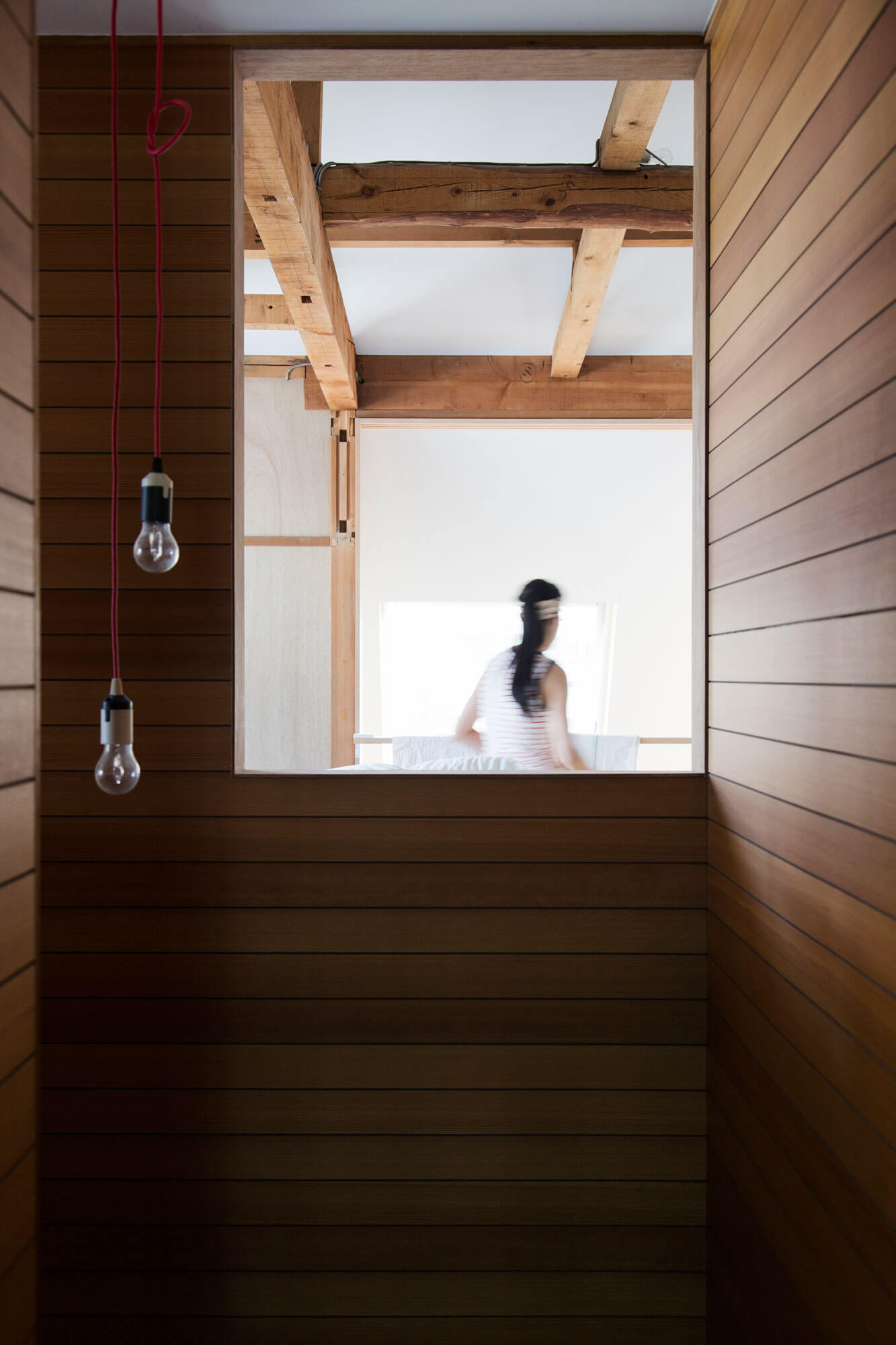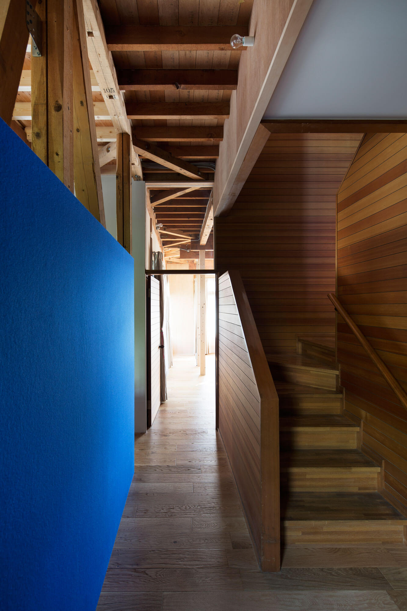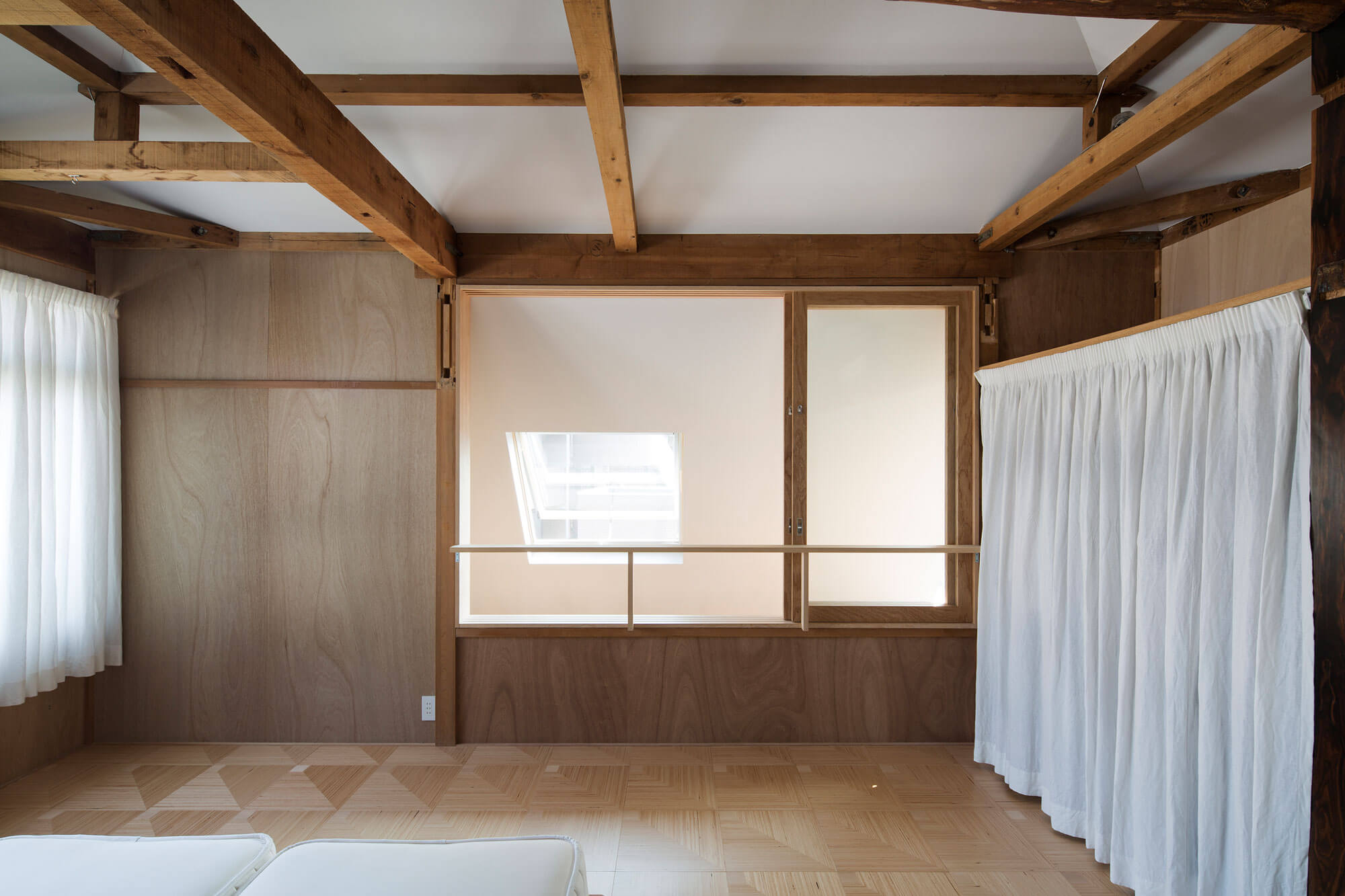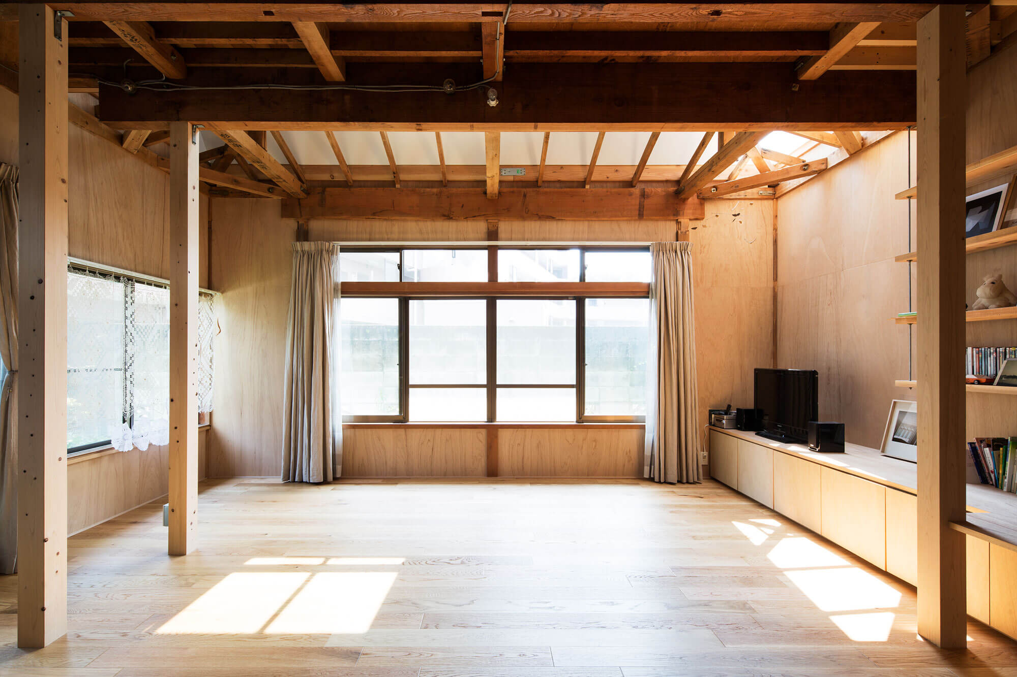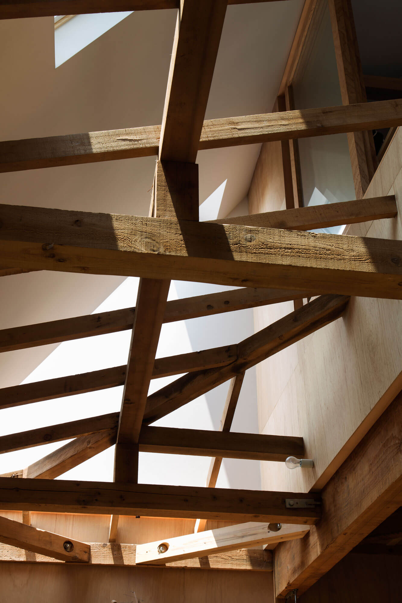 1階の壁面が2階に斜めに登り屋根面に繋がる連続的な外郭をつくり、天井を撤去したことで、その外郭の中に小屋組、根太などが表れる構成がはっきりとした。2階の床面は浮いた状態になり1階と2階が近い関係に変化した。