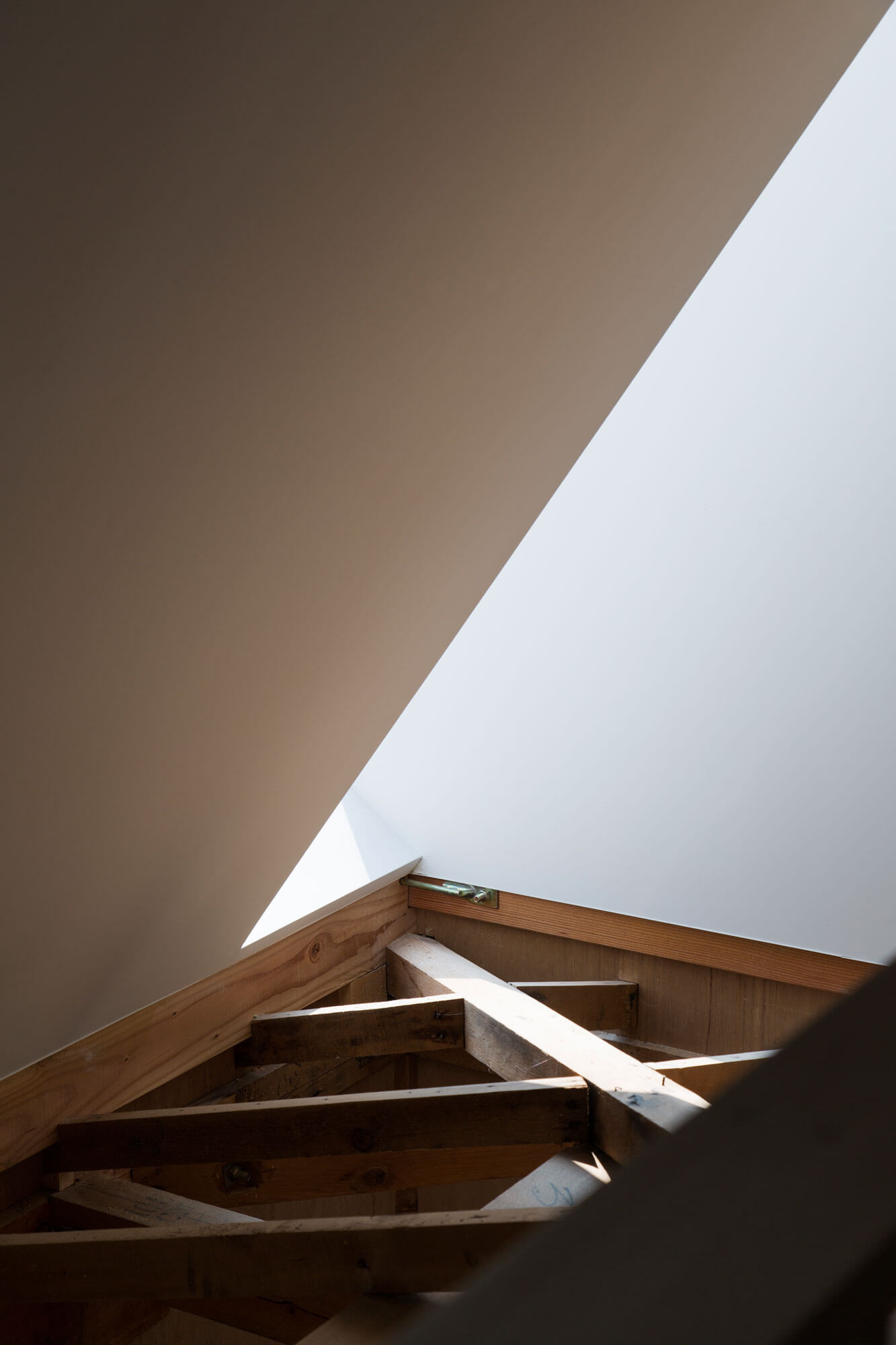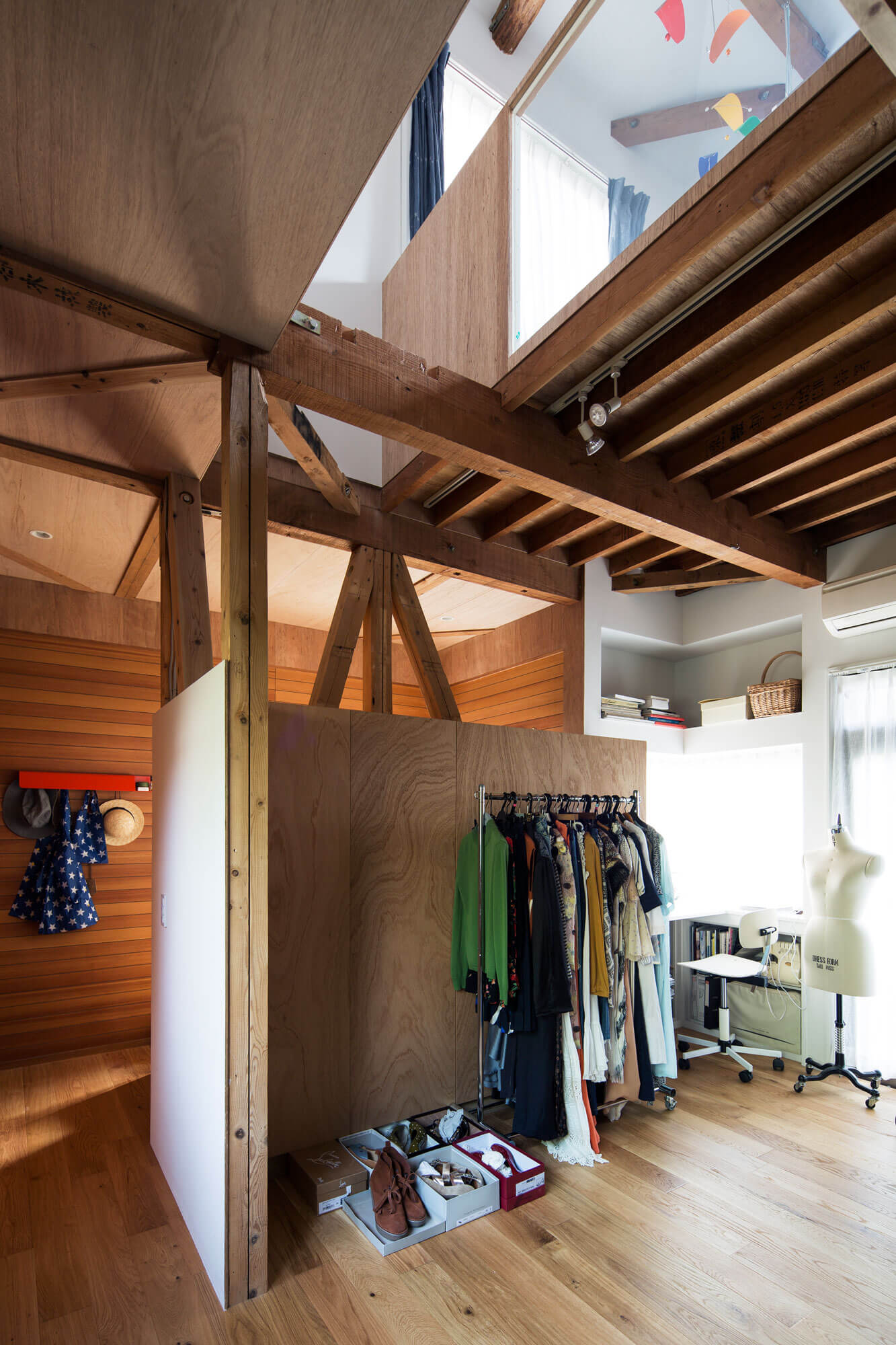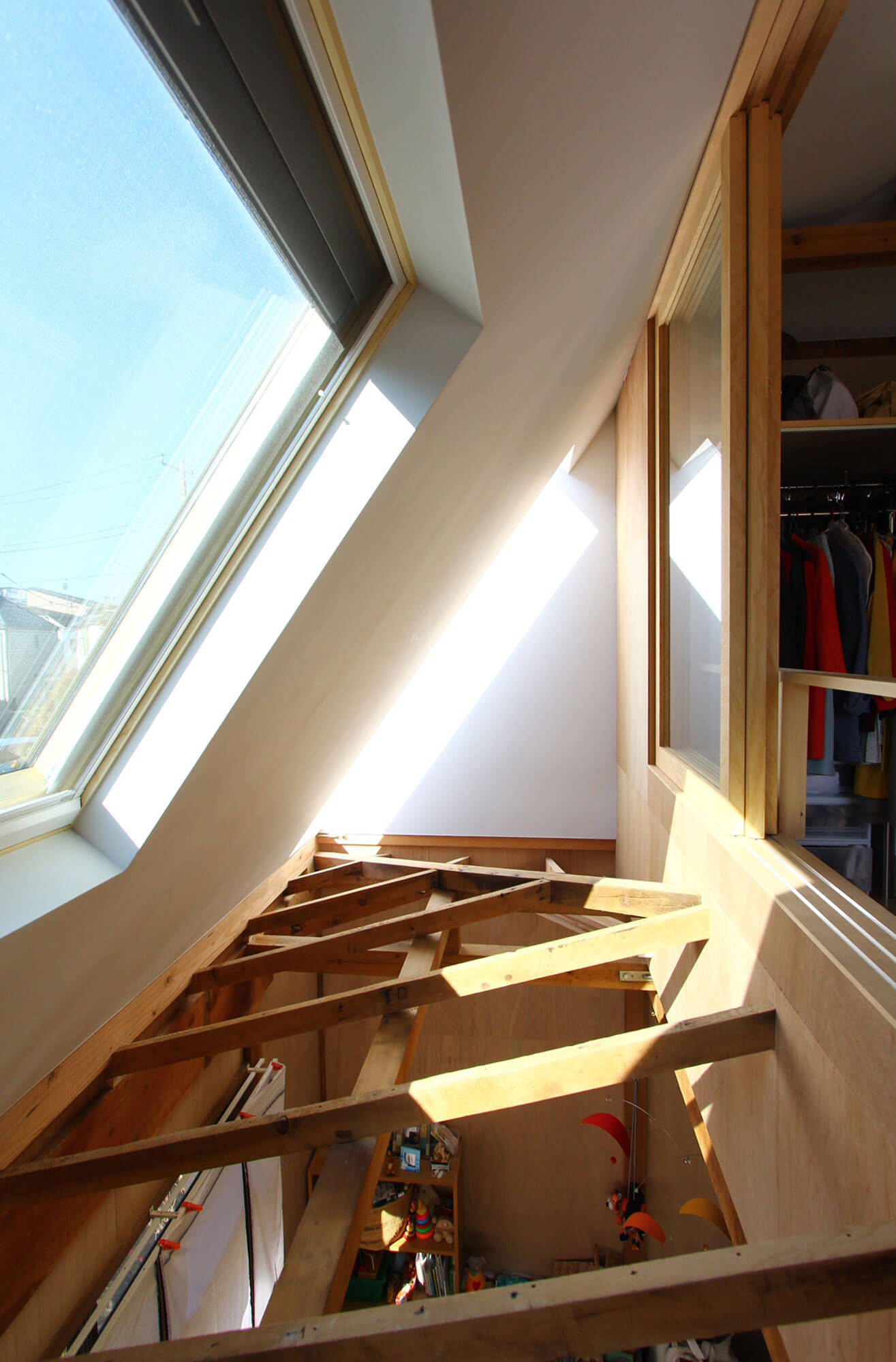 2階の外壁は1階に対してセットバックしているために残りの部分は1階の屋根となっていたが、1階リビング上部の屋根部分を撤去し、2階の寝室の梁へ斜めに壁を渡し、断面形状が三角形の吹き抜けを構成させ1、2階を繋げた。また2階の洋室の床を一部剥がすことで子供部屋と仕事場とを繋げている。
