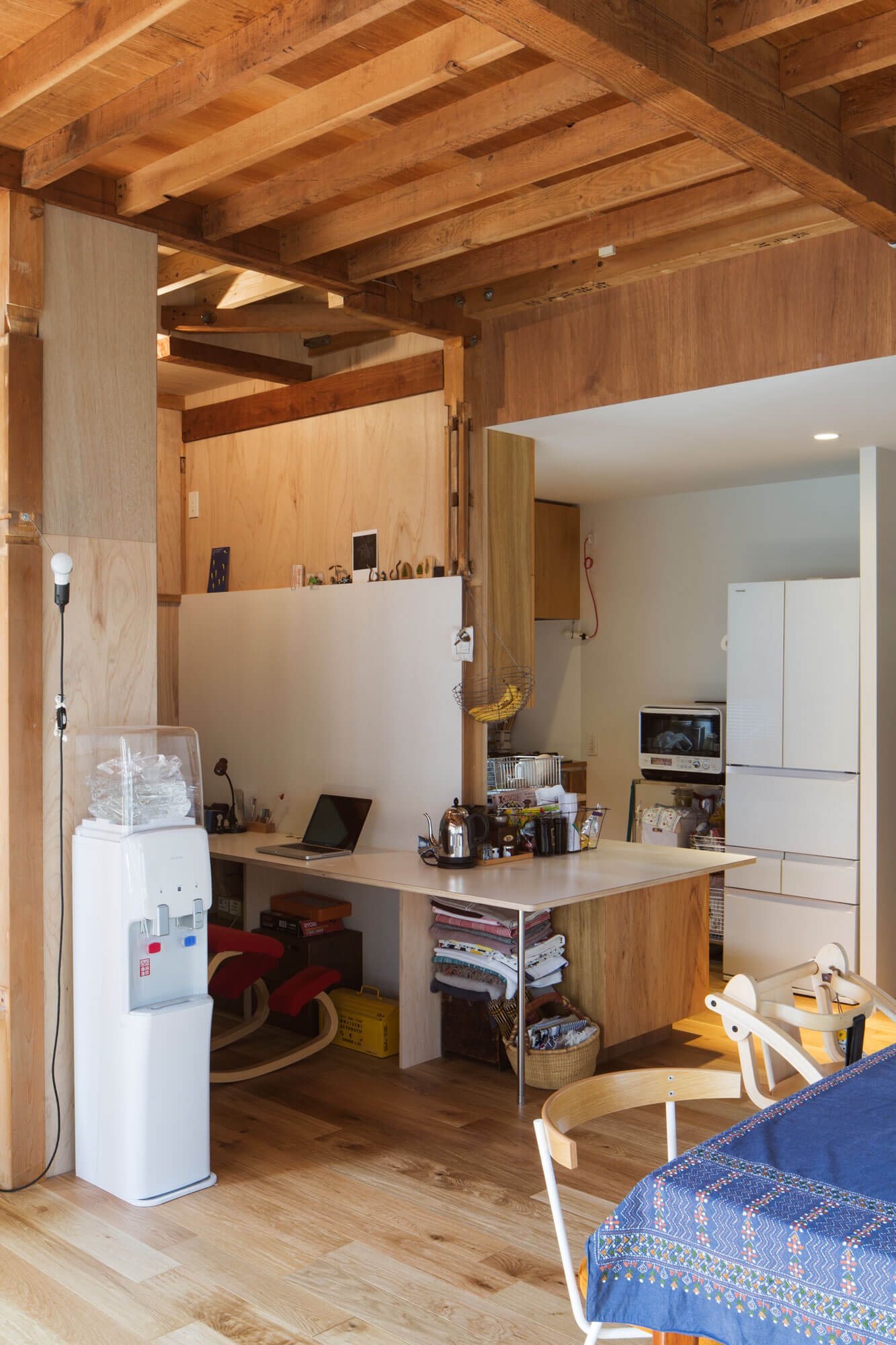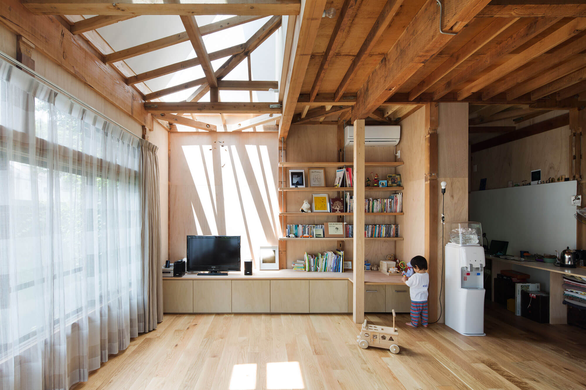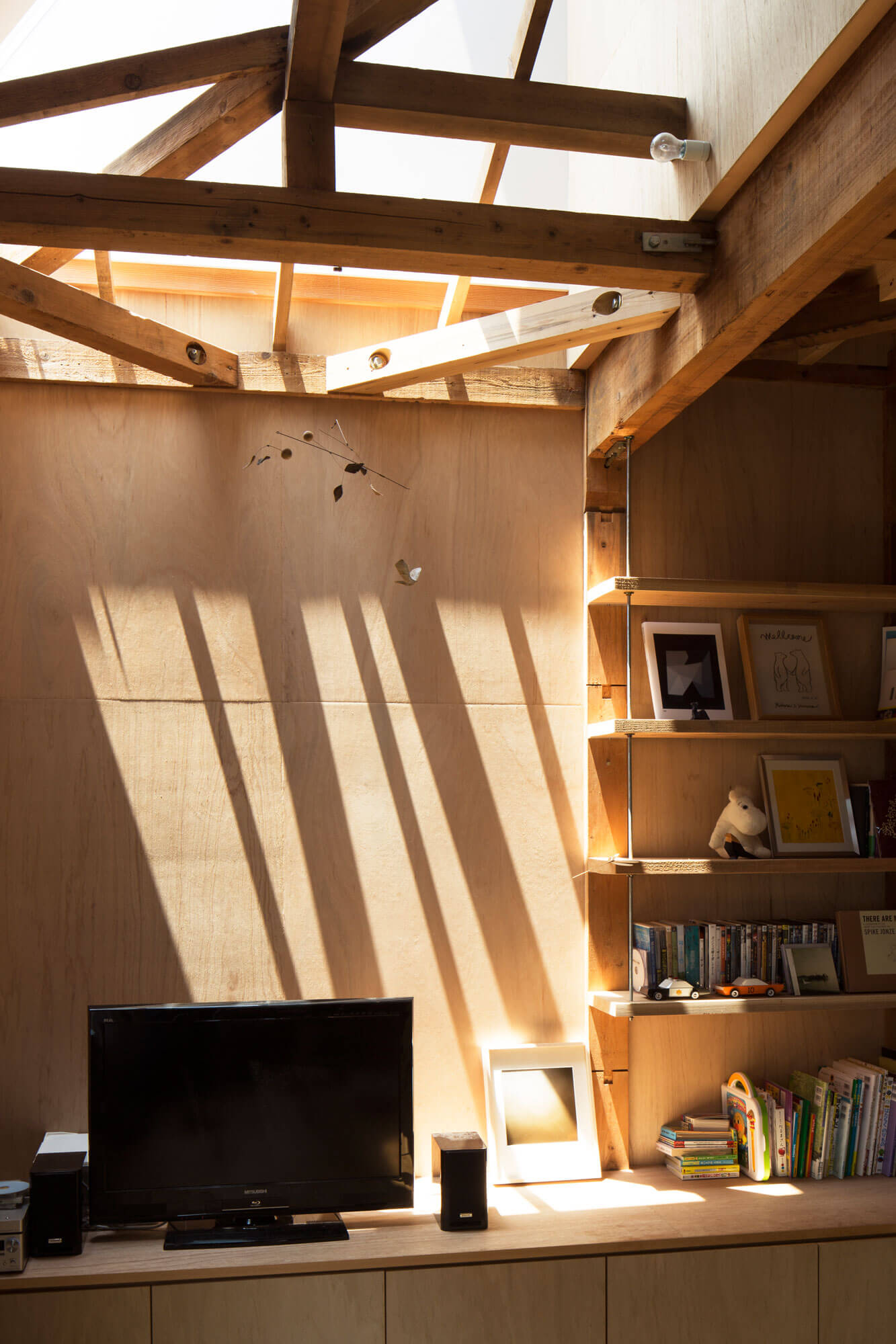 2階の外壁は1階に対してセットバックしているために残りの部分は1階の屋根となっていたが、1階リビング上部の屋根部分を撤去し、2階の寝室の梁へ斜めに壁を渡し、断面形状が三角形の吹き抜けを構成させ1、2階を繋げた。また2階の洋室の床を一部剥がすことで子供部屋と仕事場とを繋げている。