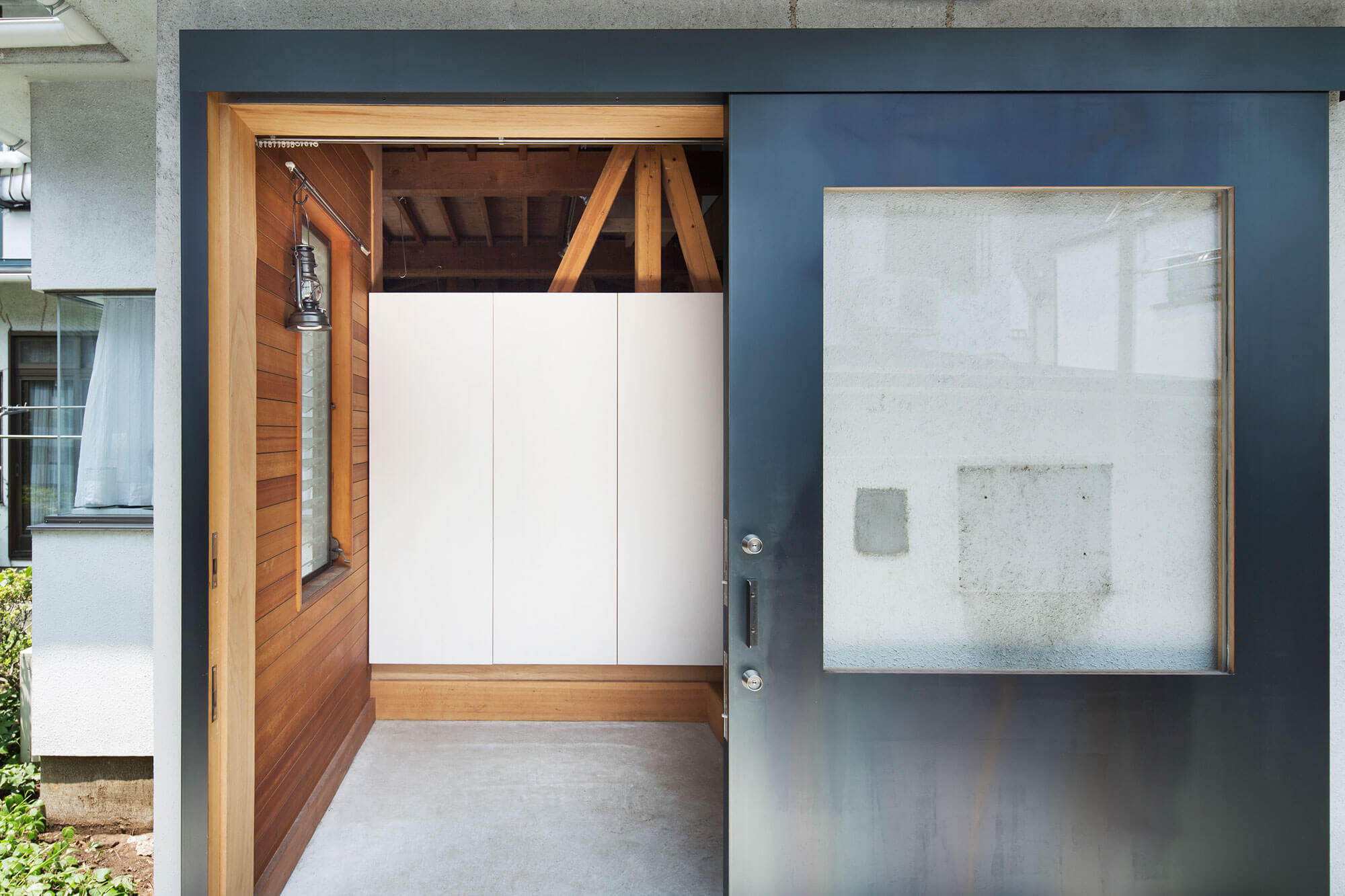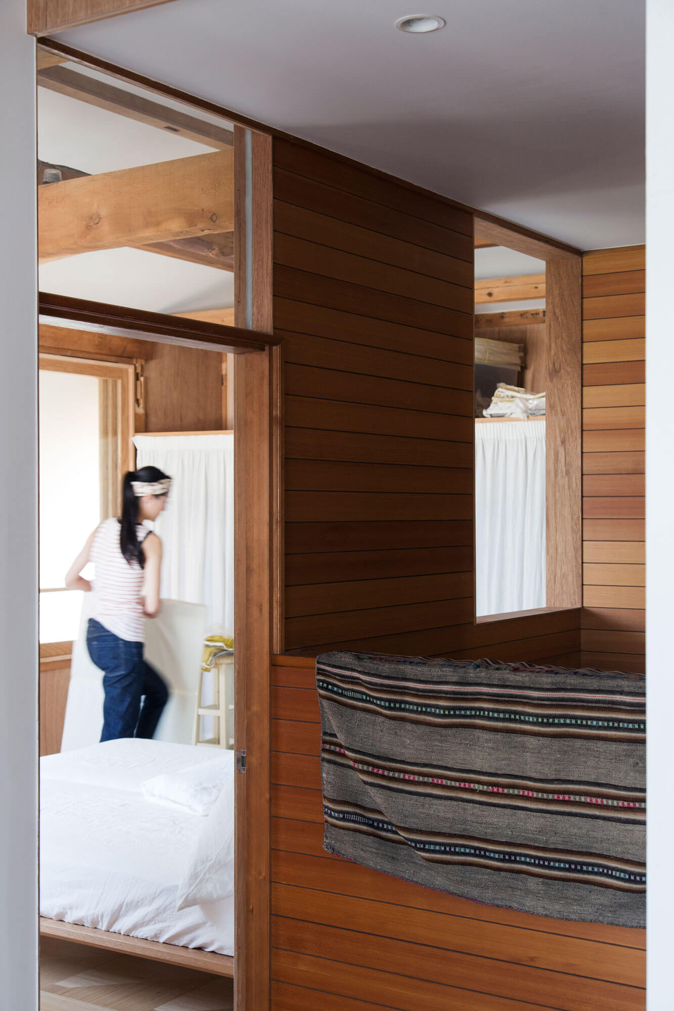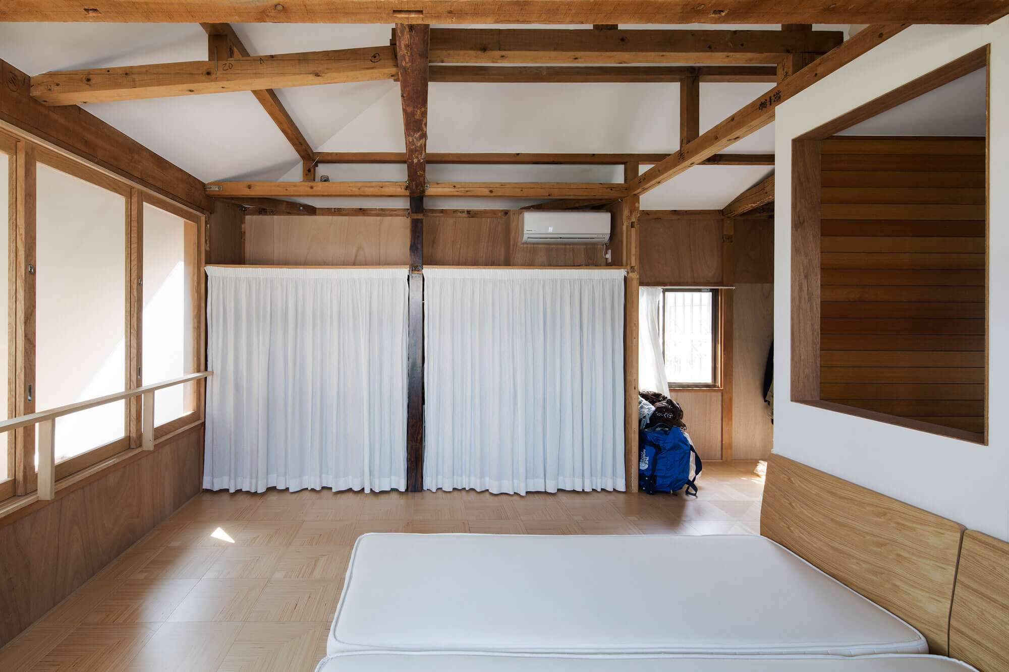 2階の洋室は廊下と繋がった子供部屋へ、やはり鴨居と襖によって仕切られた板の間、寝室(和室8畳)、納戸は大きな一室とし、壁や建具といった面で仕切られた小部屋の連続から柱、梁、鴨居、根太といったフレームを介して繋がる全体へと再構成した。