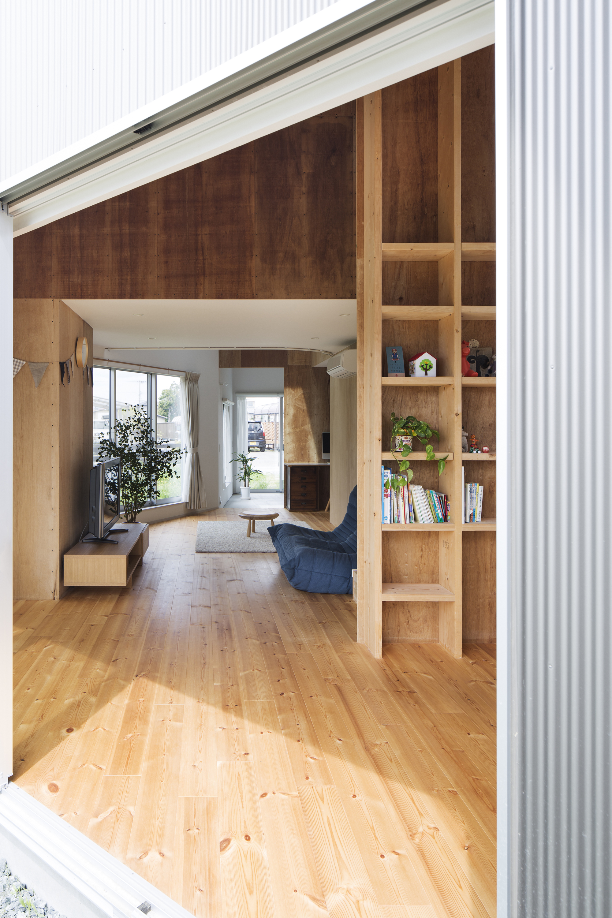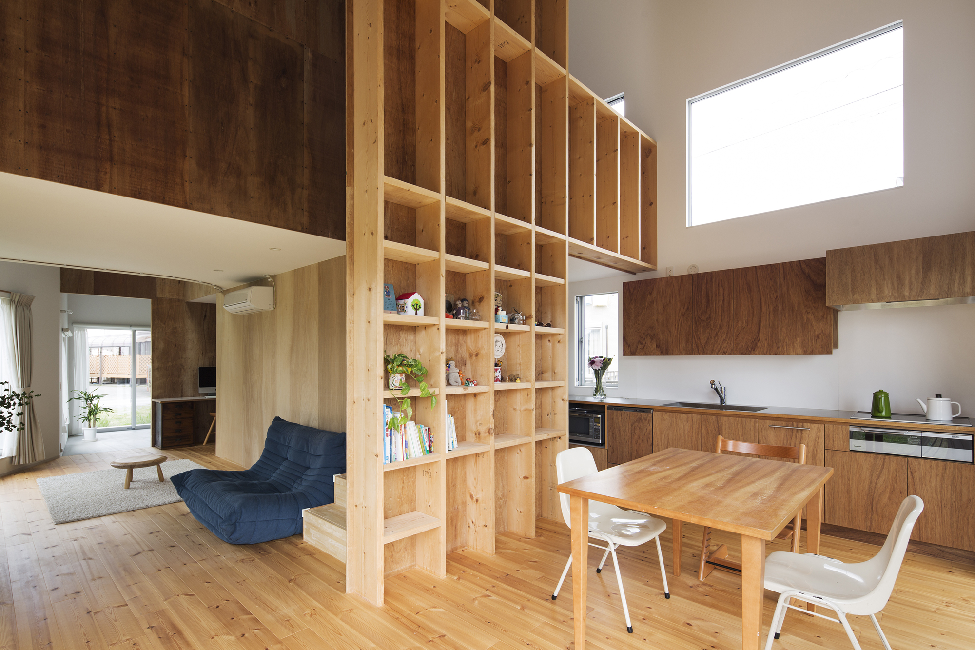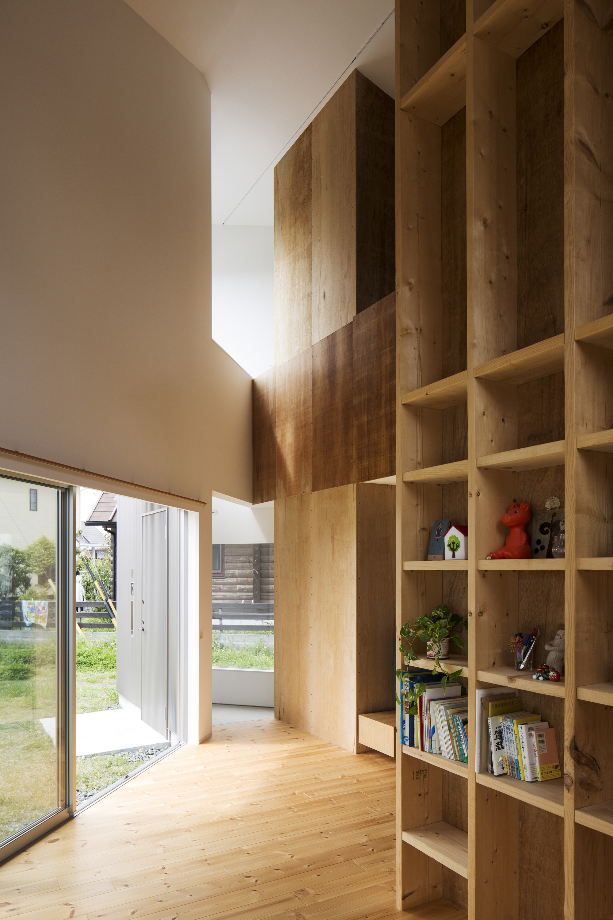そして周辺に合わせてヴォリュムを抑えるよう全体に架けた勾配屋根のトップ下に2階の床を配置している。構造は外周部が木造の在来工法、内部は2*4工法の木造のハイブリッド工法となっており、2*10の奥行きのある柱にはクライアント自ら棚を設置し、本やCD、置物などを収納している。