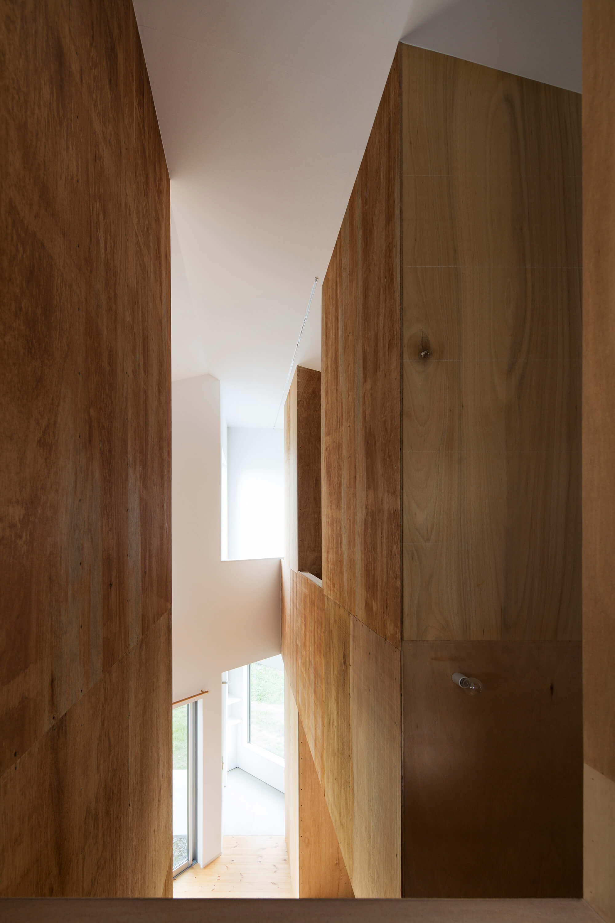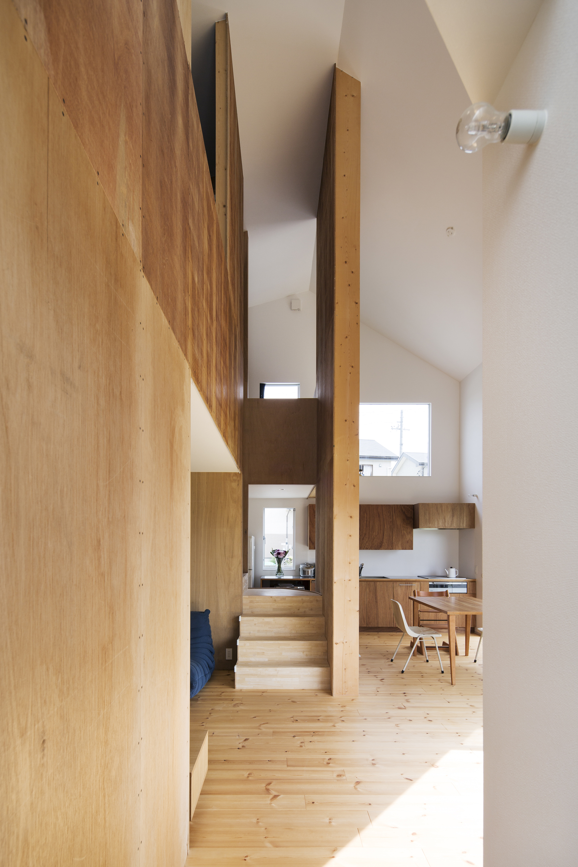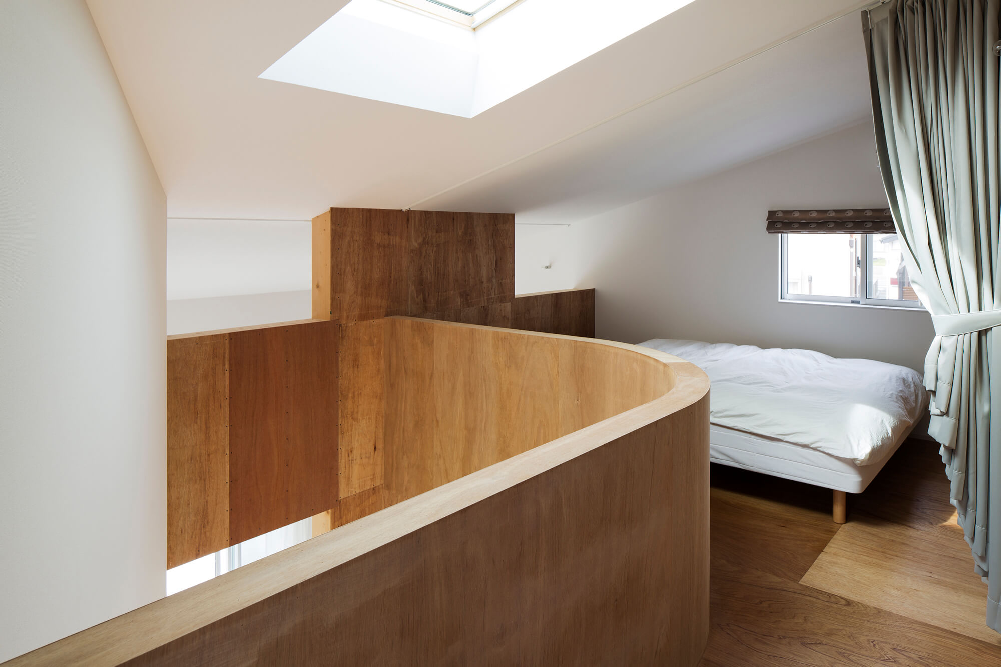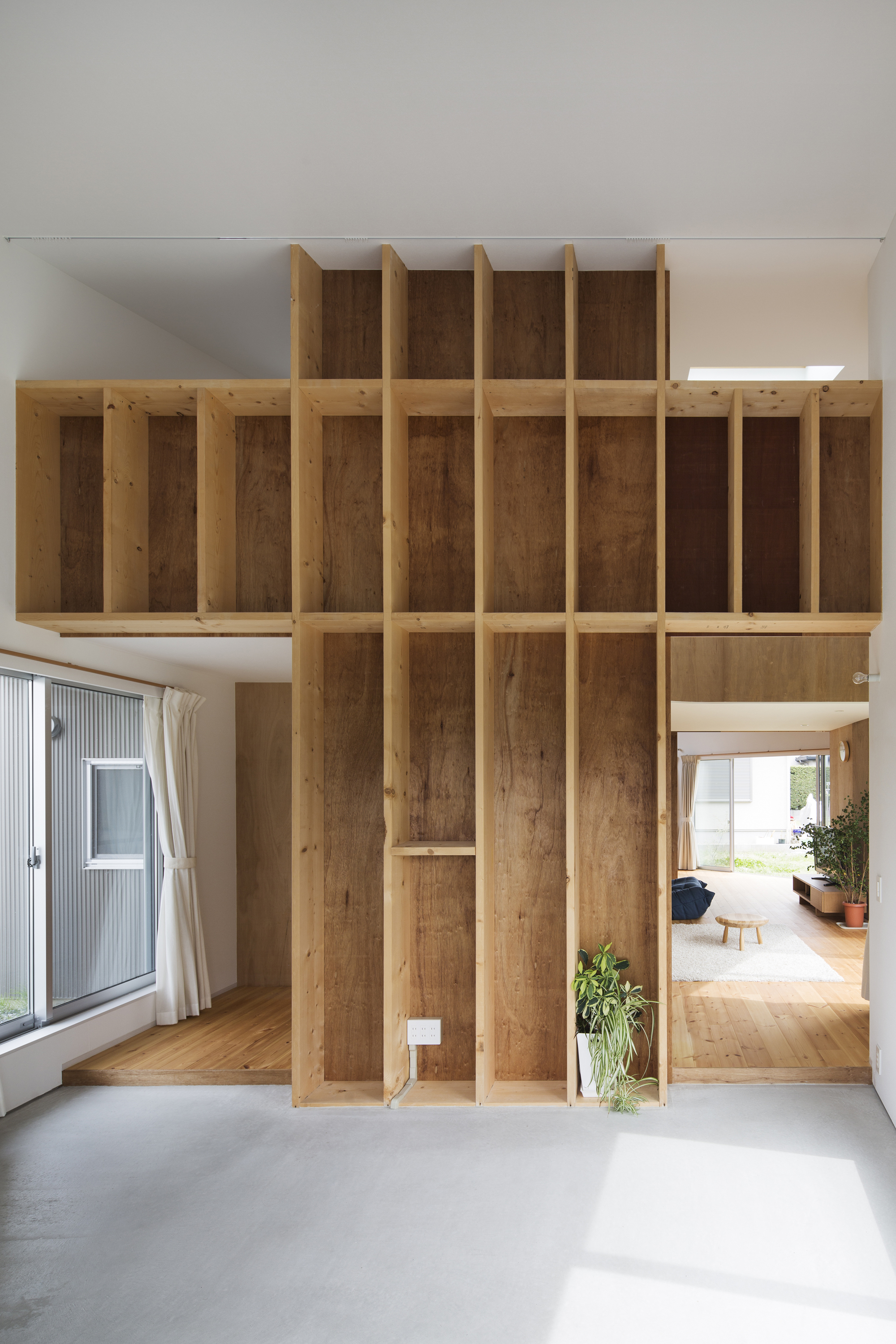 そして周辺に合わせてヴォリュムを抑えるよう全体に架けた勾配屋根のトップ下に2階の床を配置している。構造は外周部が木造の在来工法、内部は2*4工法の木造のハイブリッド工法となっており、2*10の奥行きのある柱にはクライアント自ら棚を設置し、本やCD、置物などを収納している。