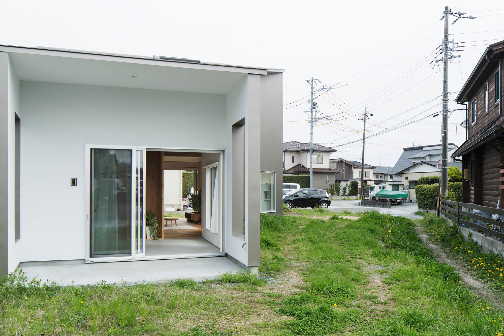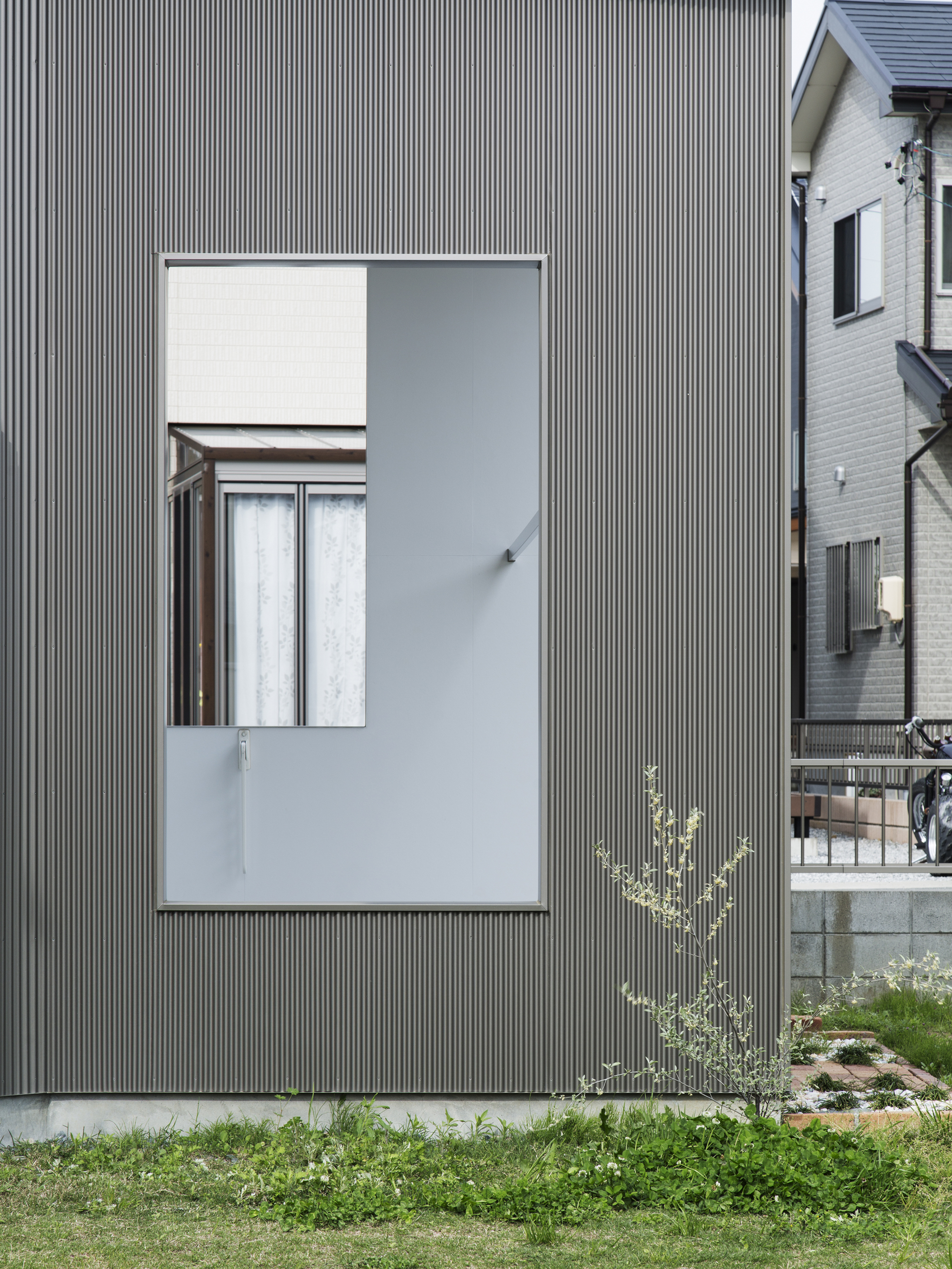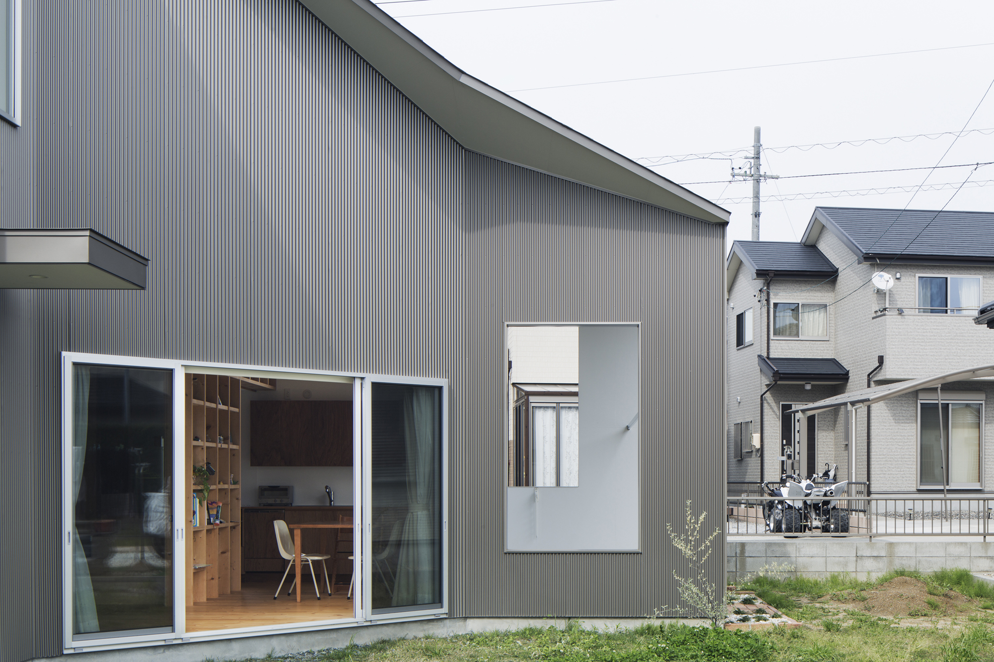 西側の市道は写真スタジオのエントランスが面し、そのまま建物は庭にそって屈折しながら向こう側の庭までつながる。子どもたちの登下校、畑仕事・神社への行き帰りなど、地域に住む人々が昔から日常的に使ってきた南側の法外道路には写真スタジオとリビングが面し、リビングにはそのまま中に入るには躊躇するけれど縁側のように座るにはちょうど良い高さの窓を設けている。また、敷地の唯一隣家と接する部分はキッチンとダイニングの庭とし、テラスでの食事・洗濯物干しなどよりプライベートな使い方ができるようにと庭それぞれを性格付けし、「みち」との関わり方を変えている。