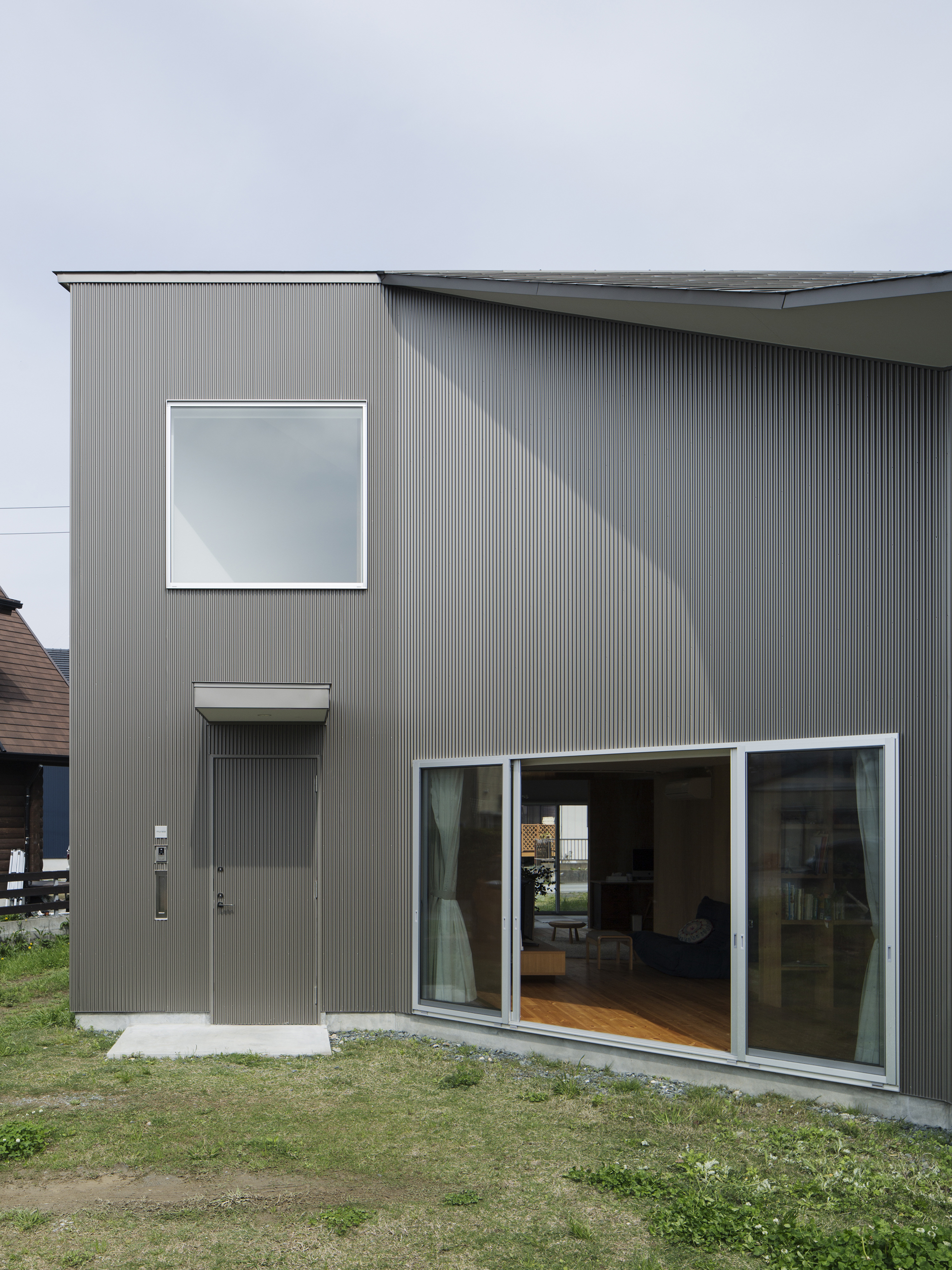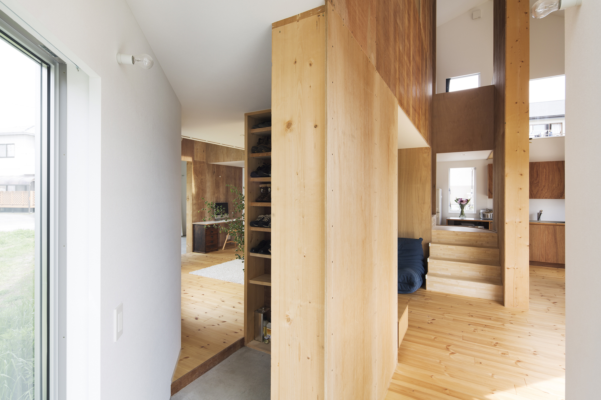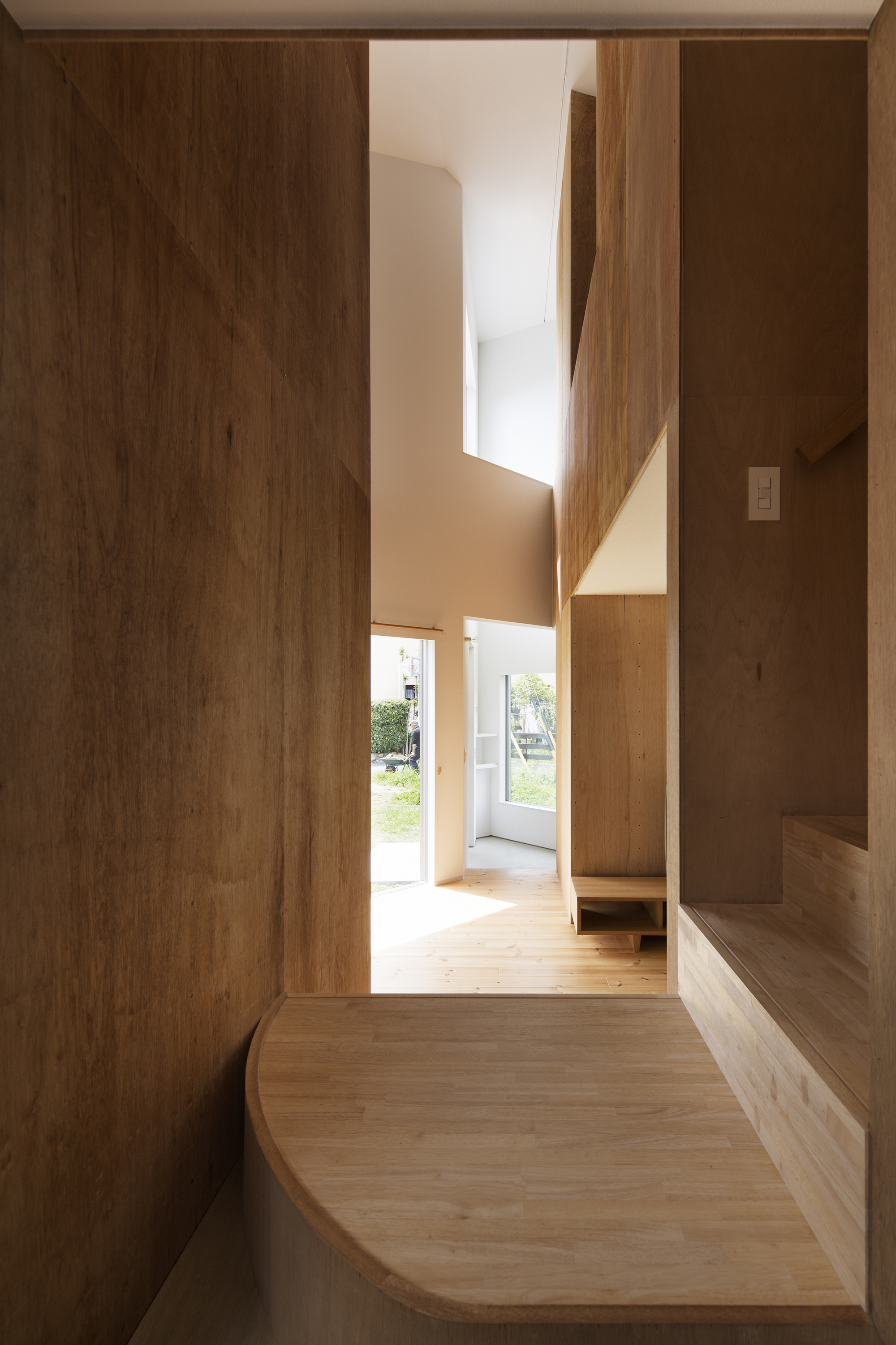 西側の市道は写真スタジオのエントランスが面し、そのまま建物は庭にそって屈折しながら向こう側の庭までつながる。子どもたちの登下校、畑仕事・神社への行き帰りなど、地域に住む人々が昔から日常的に使ってきた南側の法外道路には写真スタジオとリビングが面し、リビングにはそのまま中に入るには躊躇するけれど縁側のように座るにはちょうど良い高さの窓を設けている。また、敷地の唯一隣家と接する部分はキッチンとダイニングの庭とし、テラスでの食事・洗濯物干しなどよりプライベートな使い方ができるようにと庭それぞれを性格付けし、「みち」との関わり方を変えている。