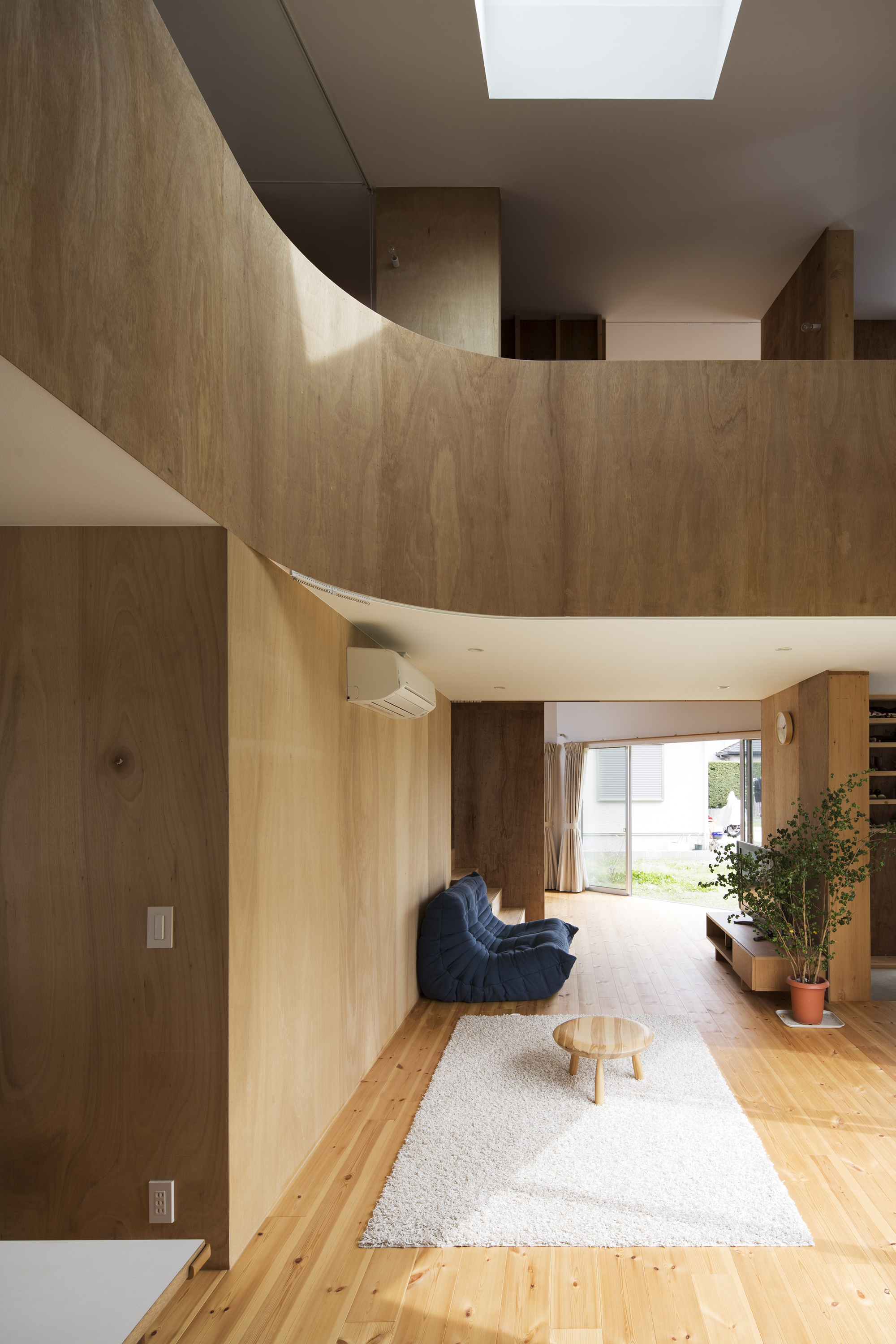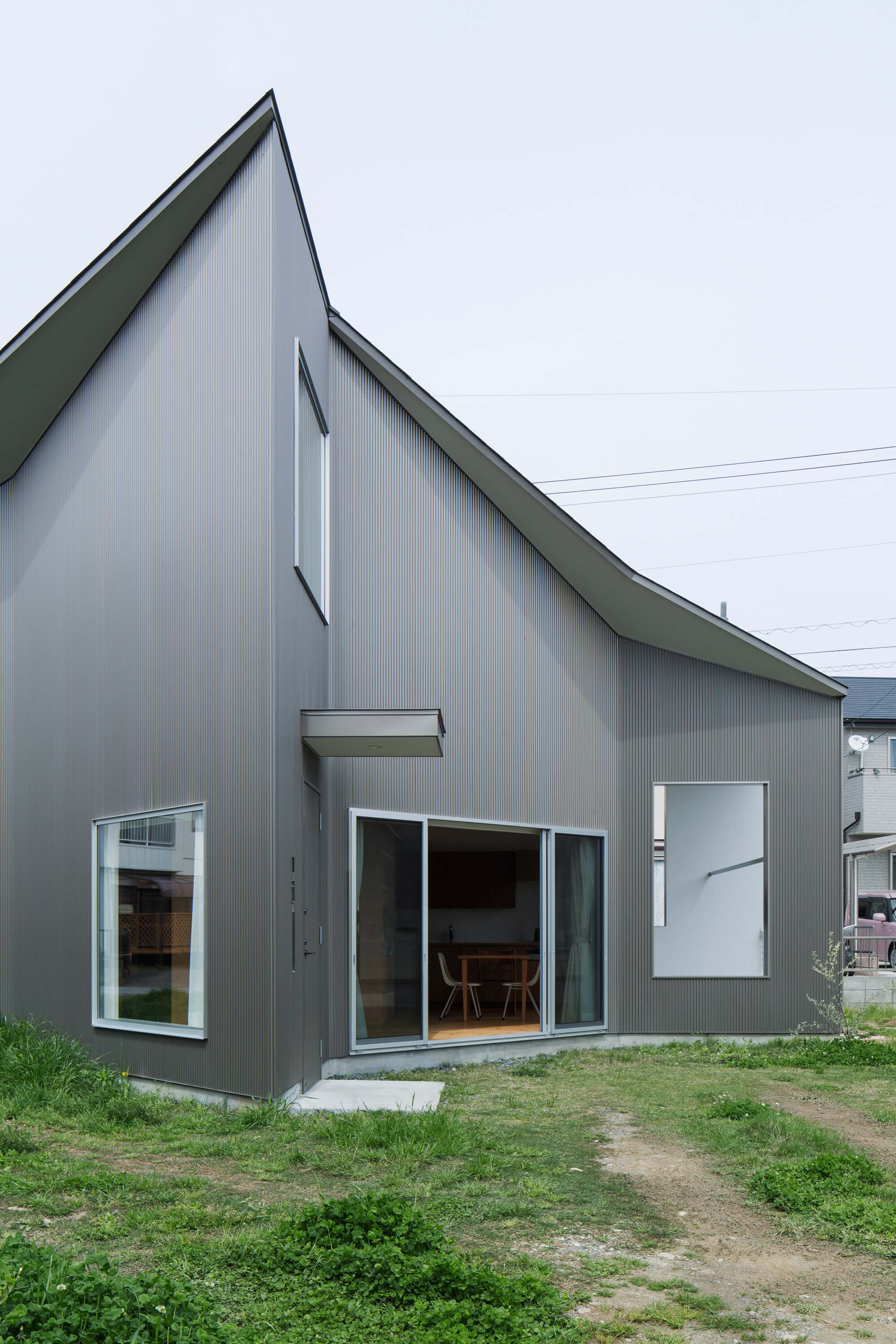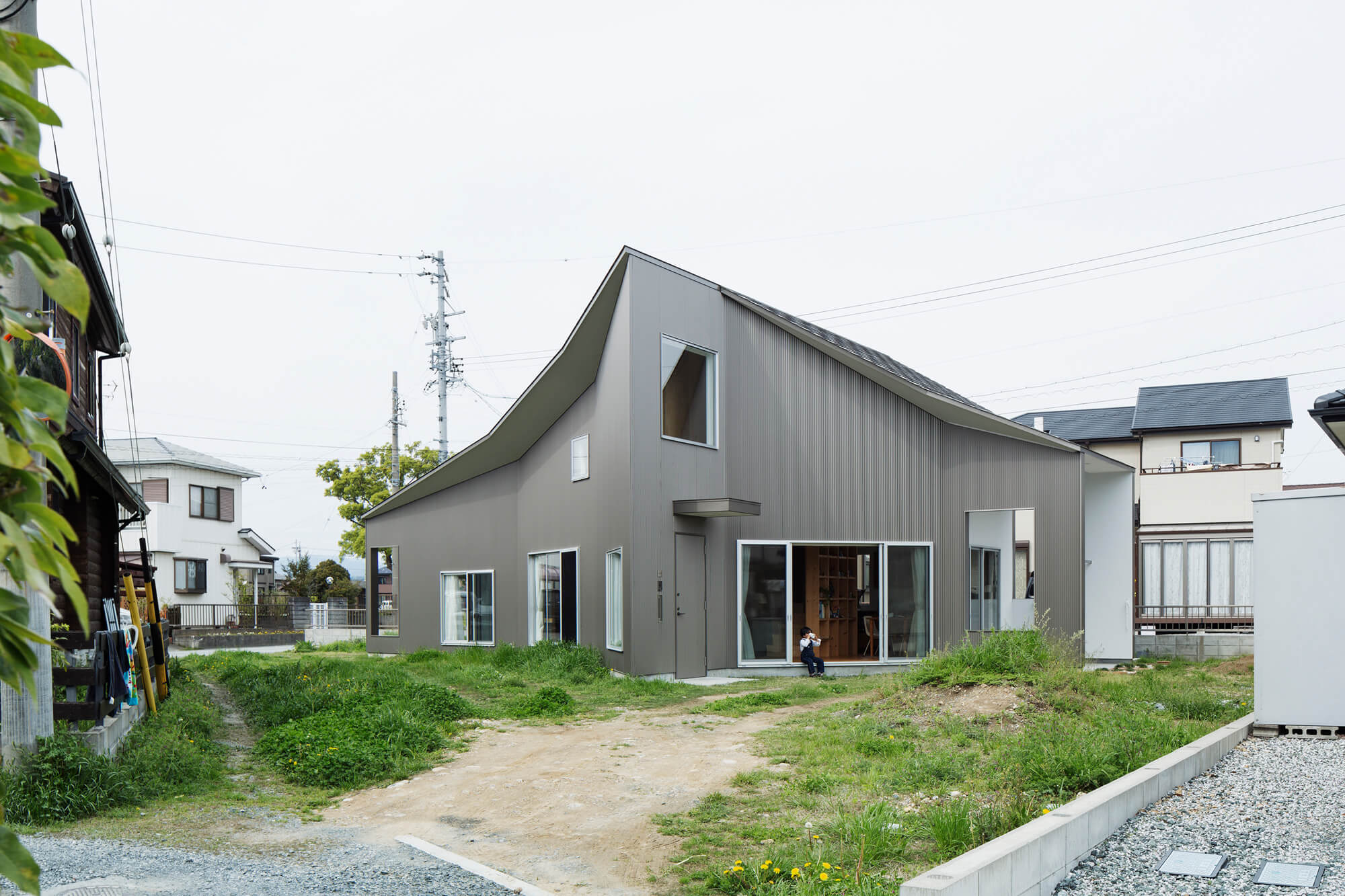 クライアント夫婦は庭での生活を楽しみながら子育てをしたいと、大きなのんびりしたこの土地を選んだ。長細い三角形の端をカットしたような敷地形状で、西側は市道、北側は隣家数軒の共有路、南側はかつて農道だった曖昧な存在の斜めに通り抜ける法外道路、と一辺を除きすべて「みち」に接している。それら性格の異なる「みち」と庭の関わりを考え建物の配置を決めていった。
